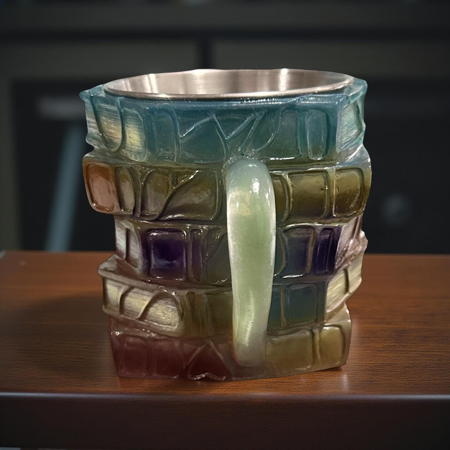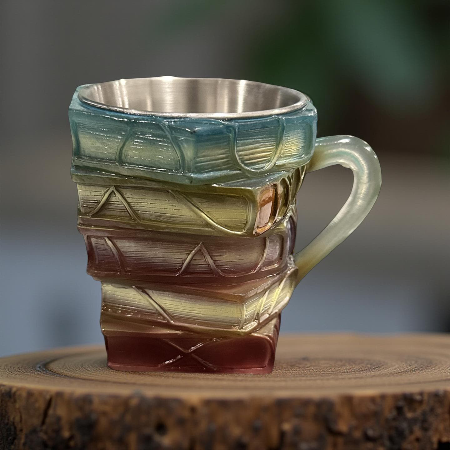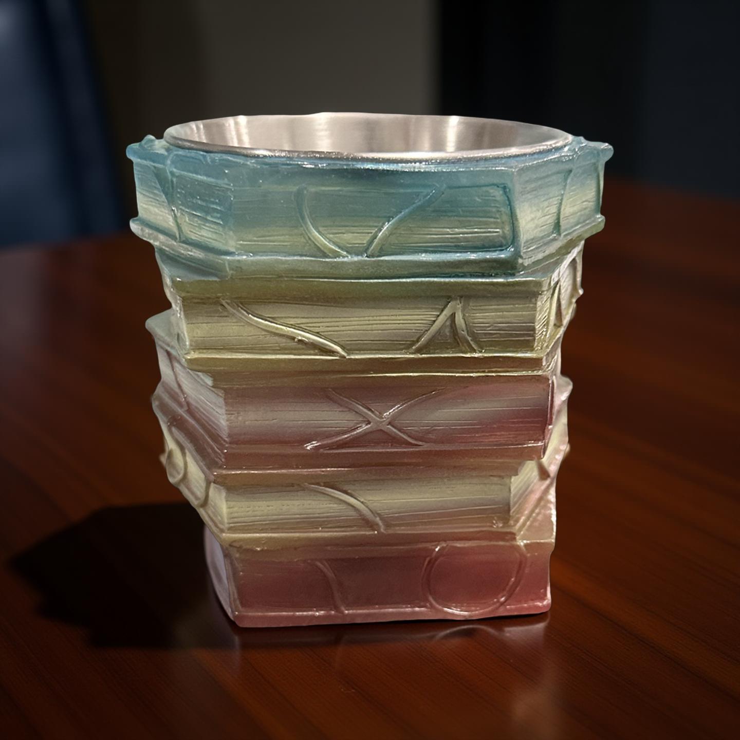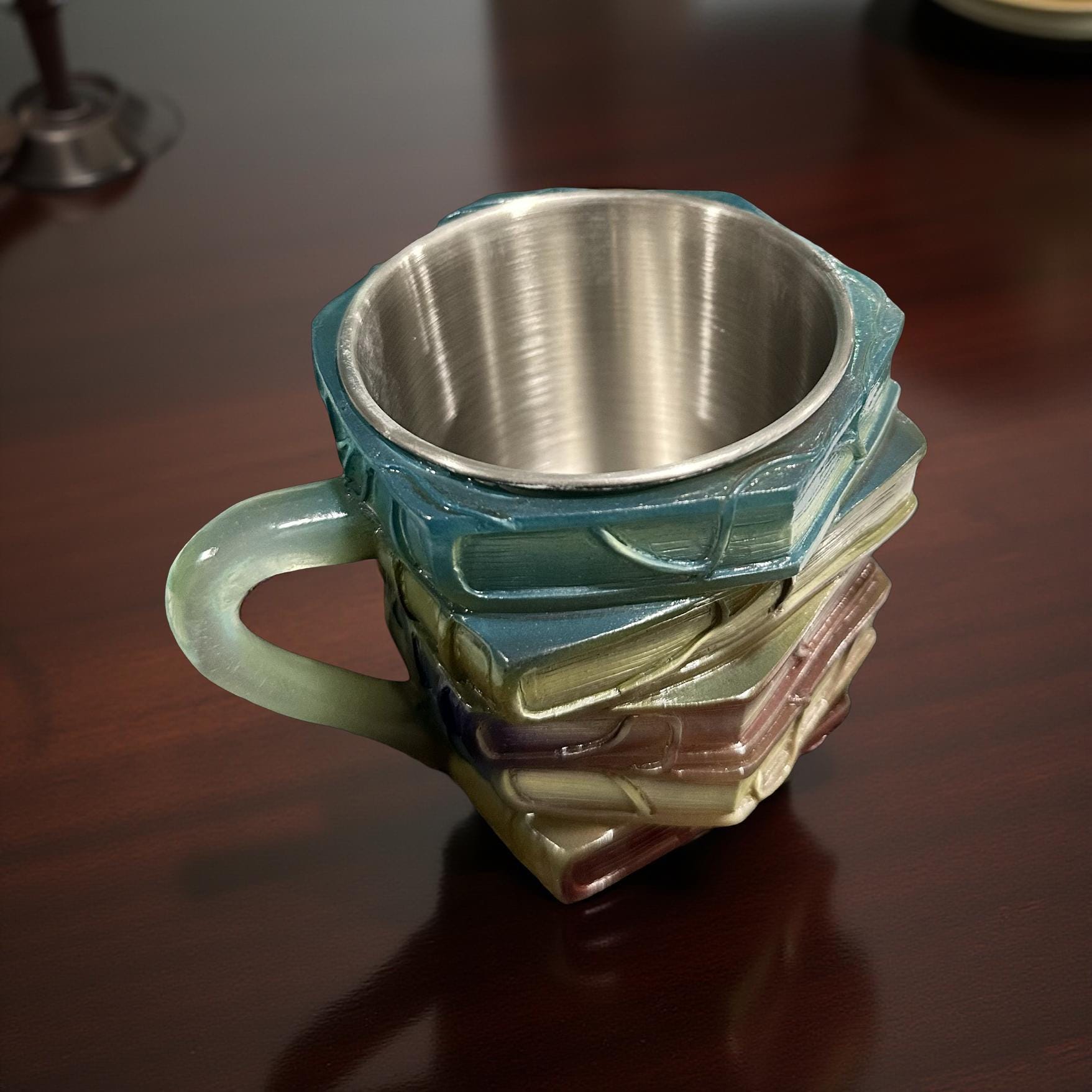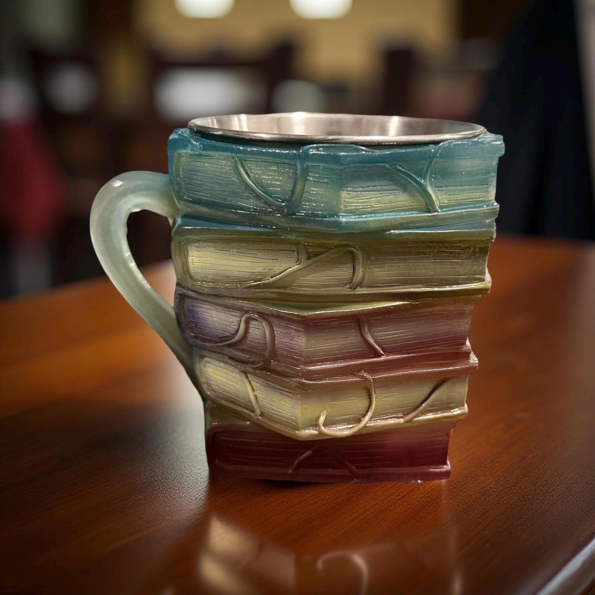 handcrafted 11oz painted book mug, featuring a vibrant and detailed 3D resin stack of colorful books.
