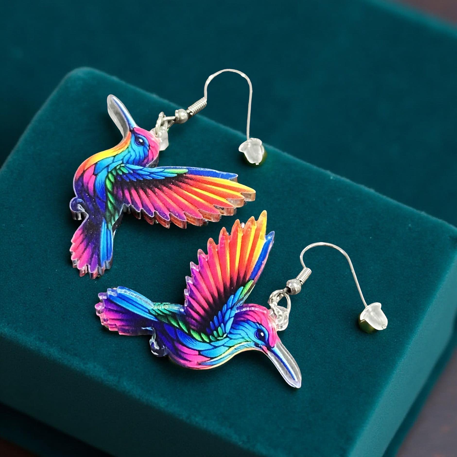 Stunning hummingbird earrings with mosaic-like pattern creating a beautiful play of colors when light shines through the translucent acrylic