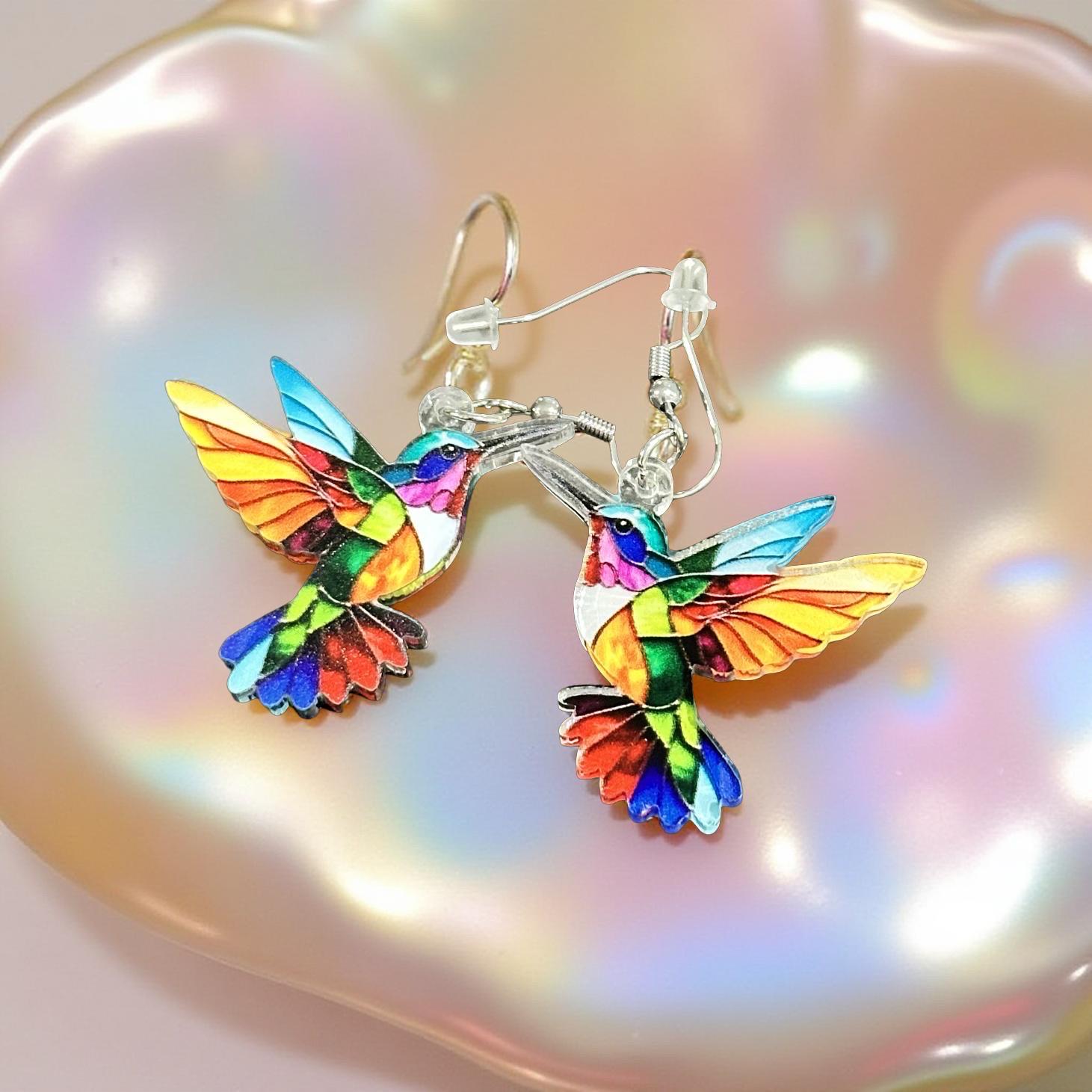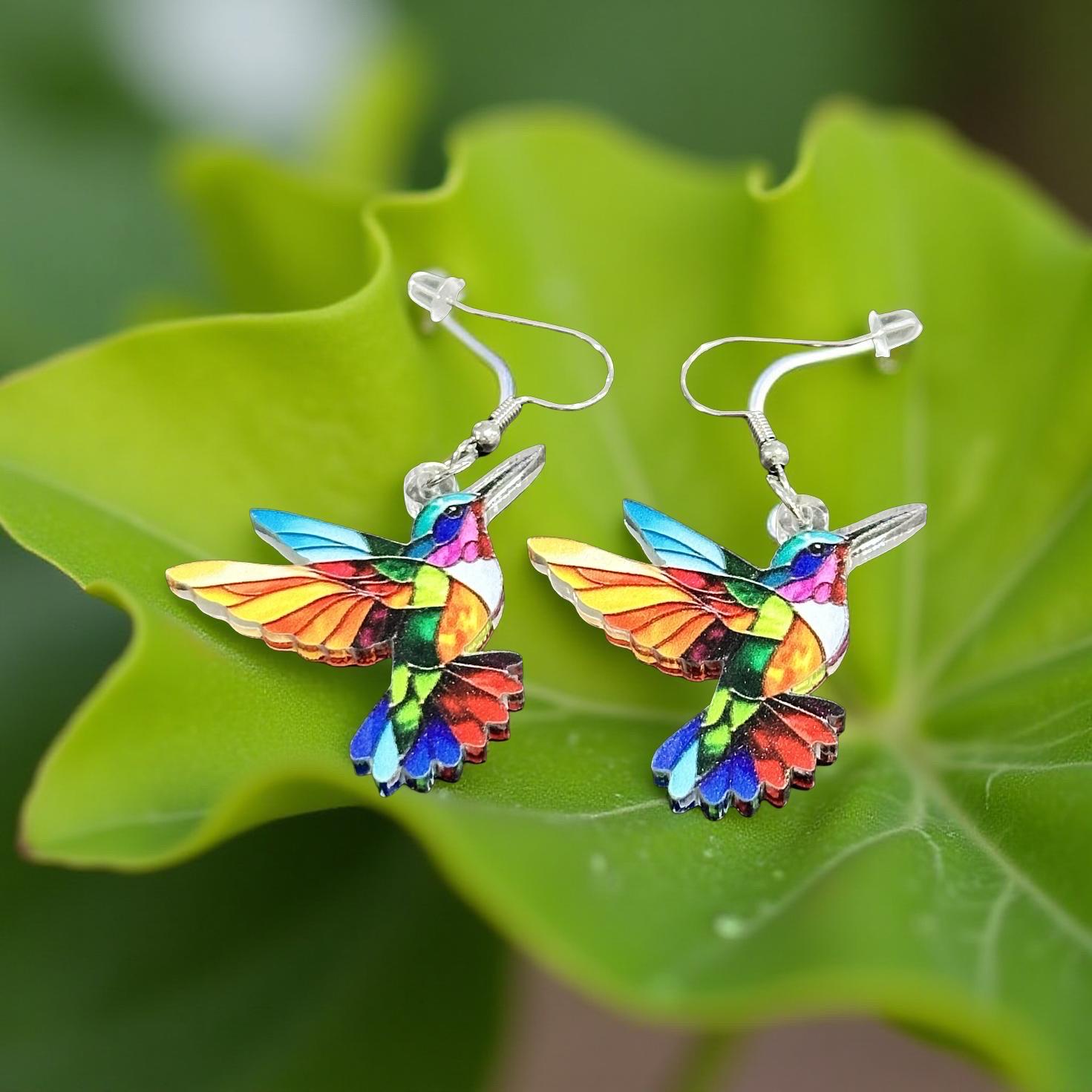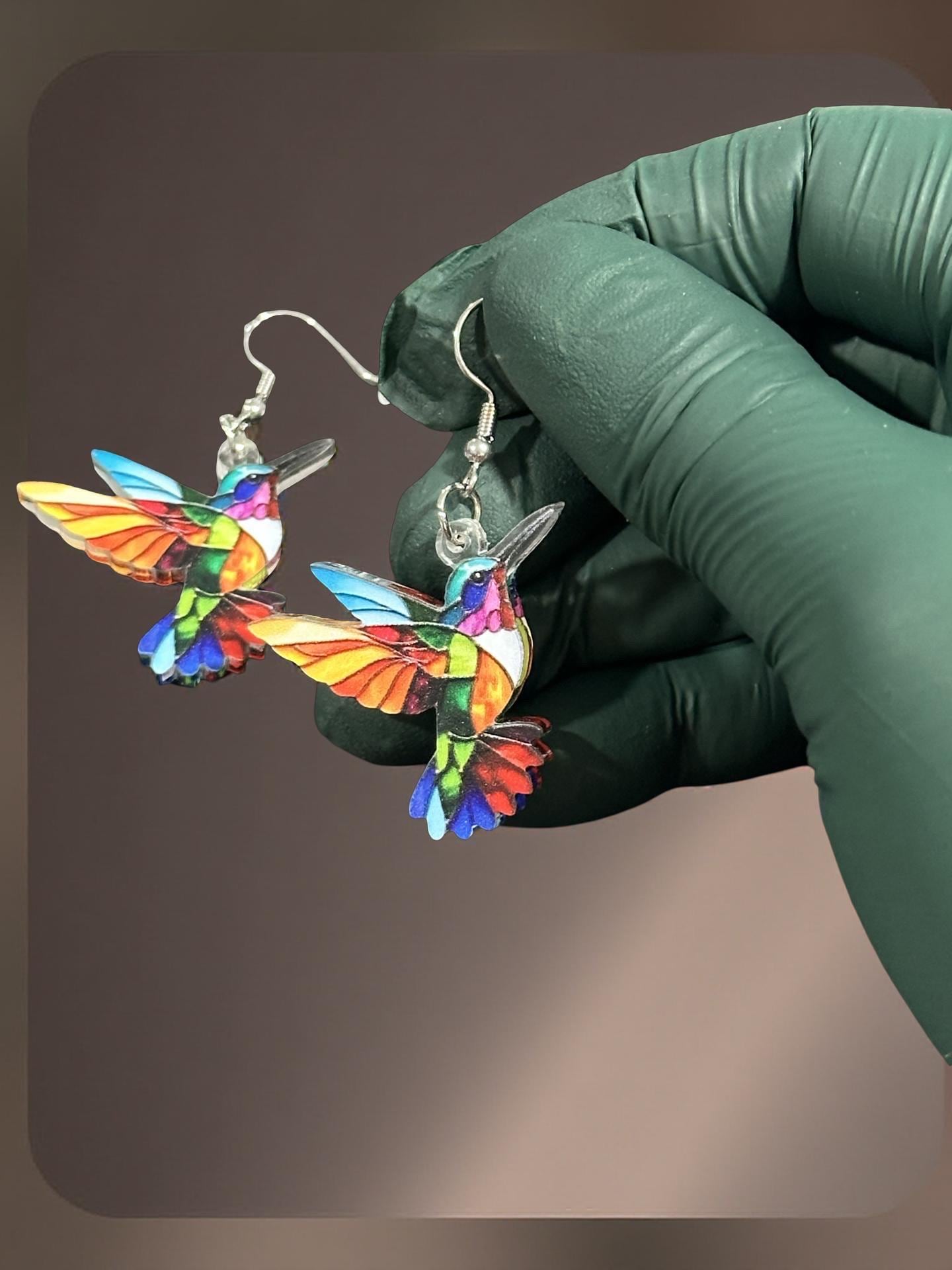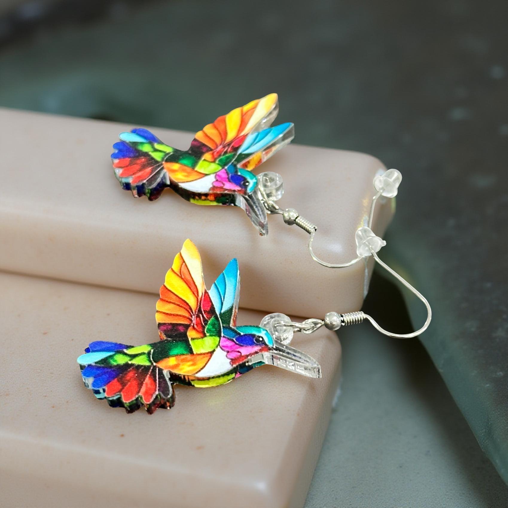 Stunning hummingbird earrings with mosaic-like pattern creating a beautiful play of colors when light shines through the translucent acrylic