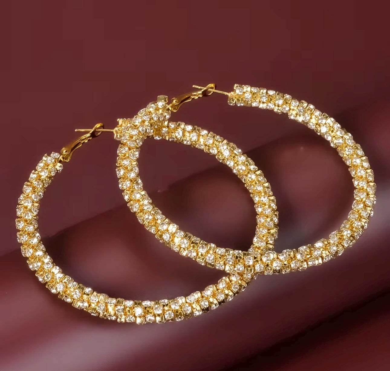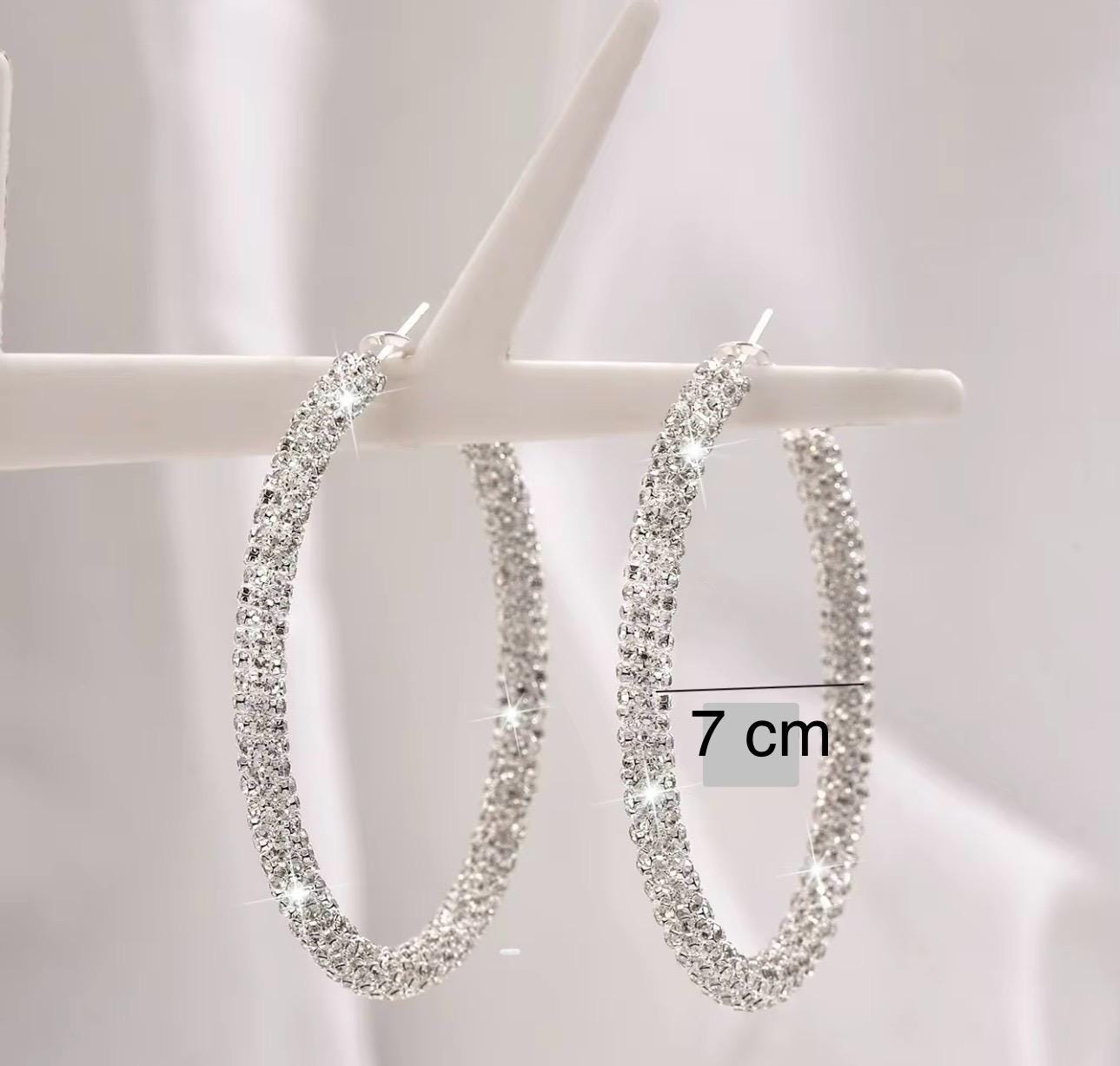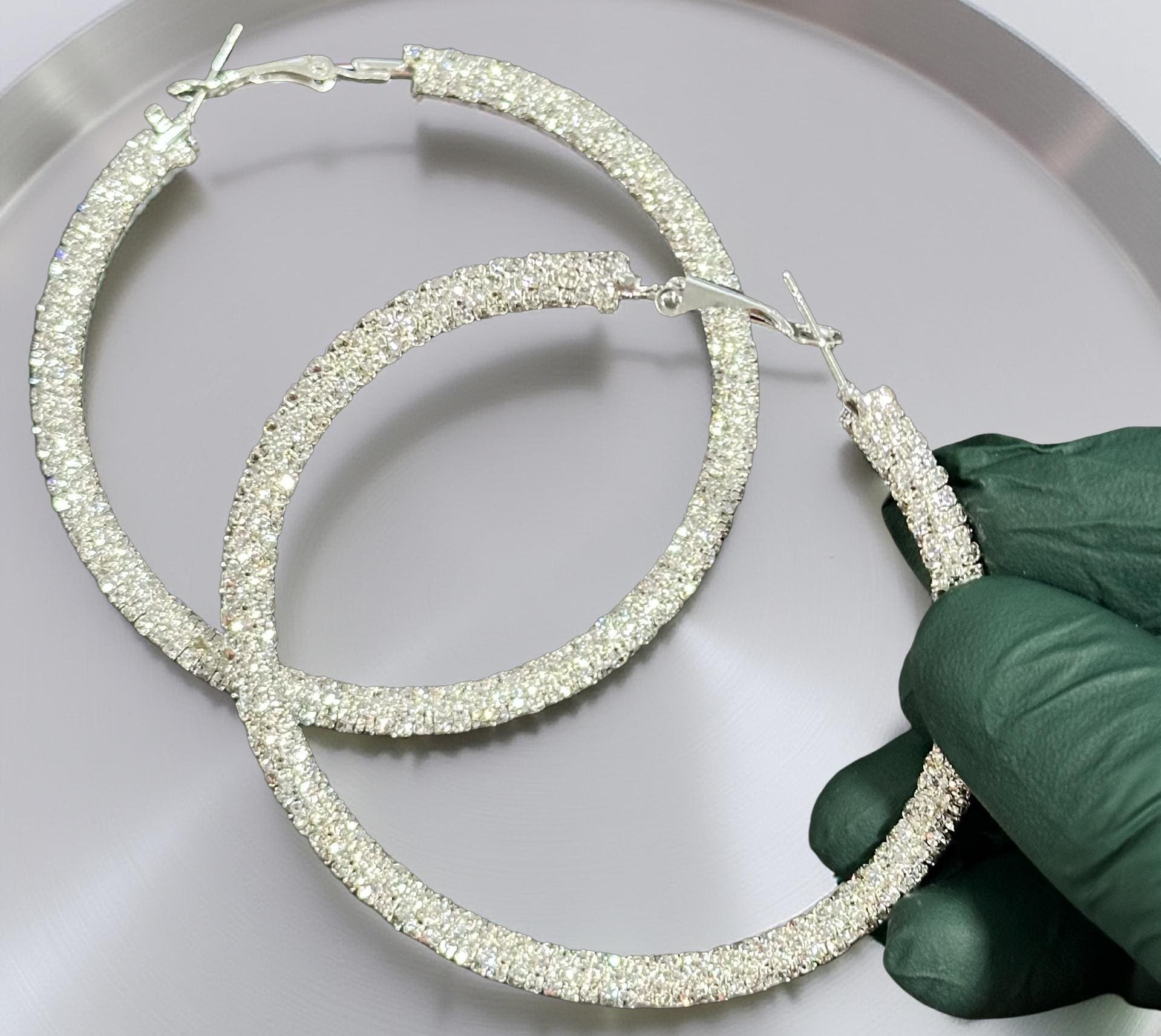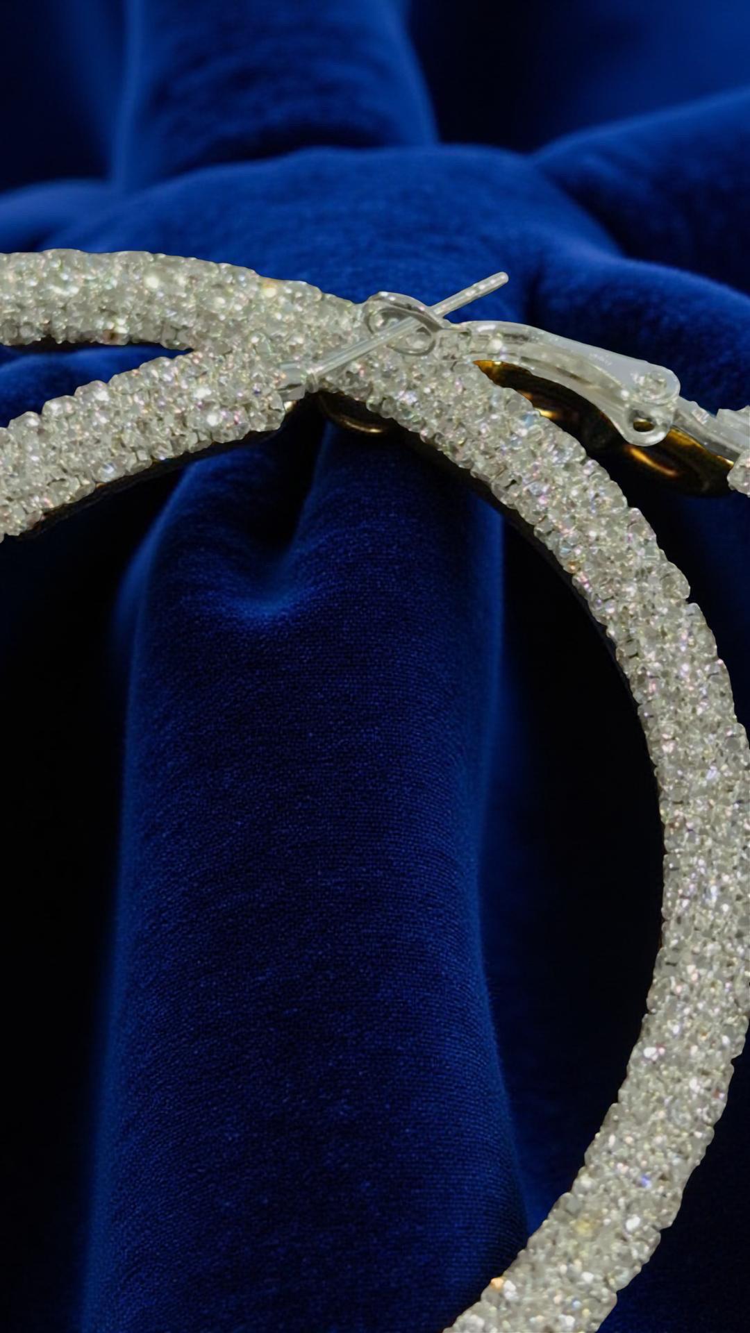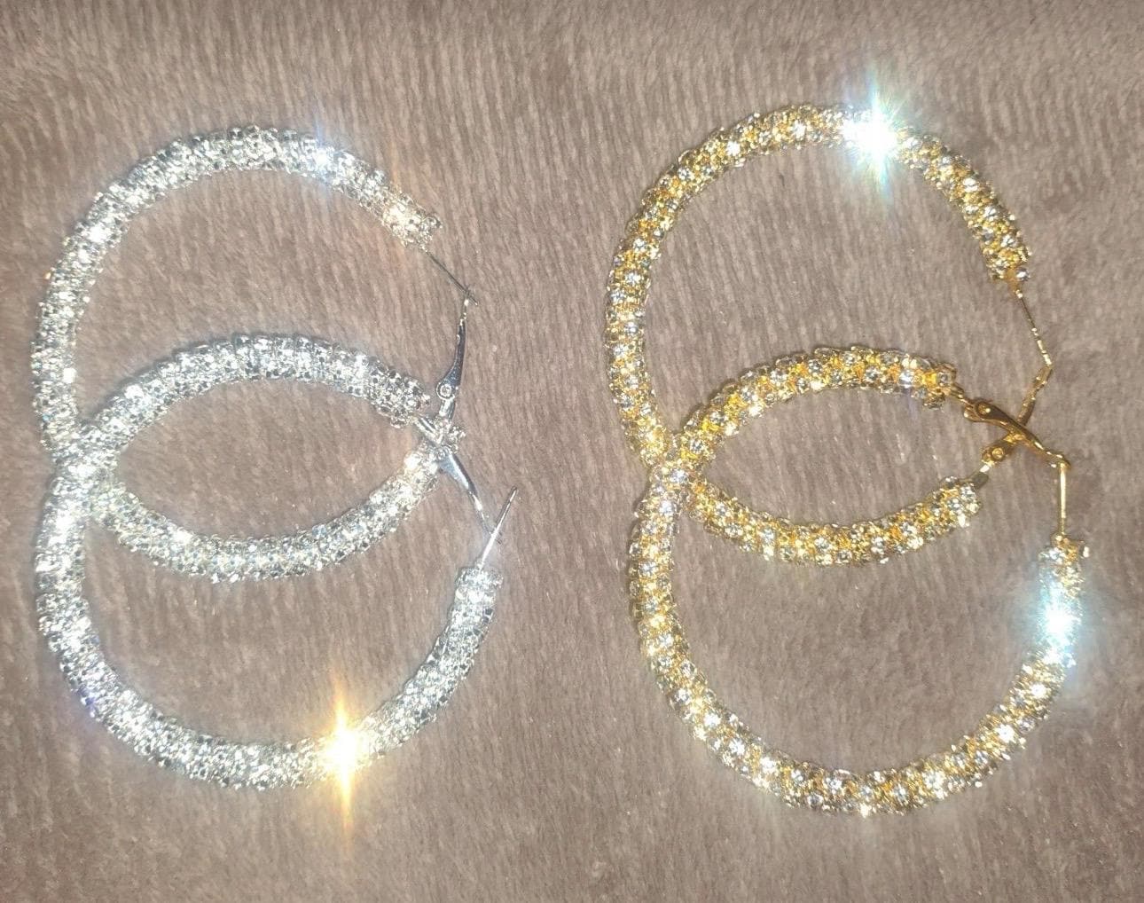 * DESIGN: Large statement hoop earrings featuring a stunning textured glitter surface with rhinestone-wrapped detailing for maximum sparkle