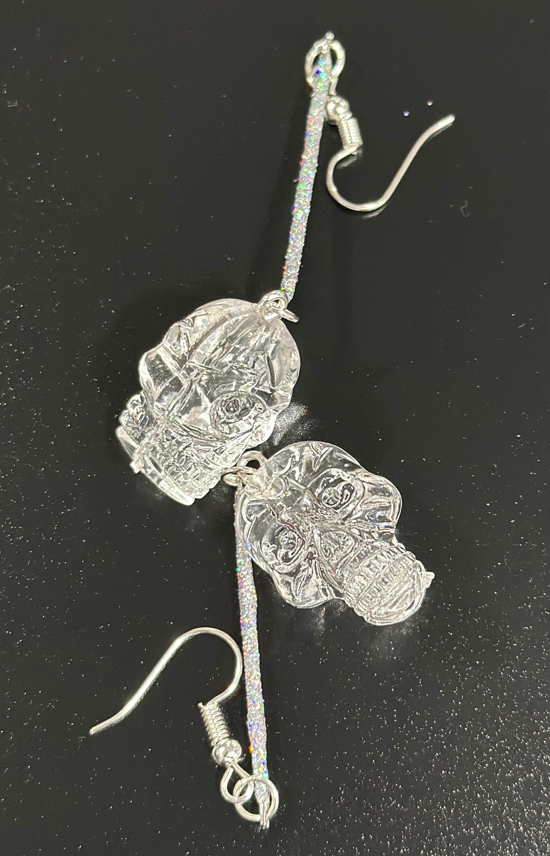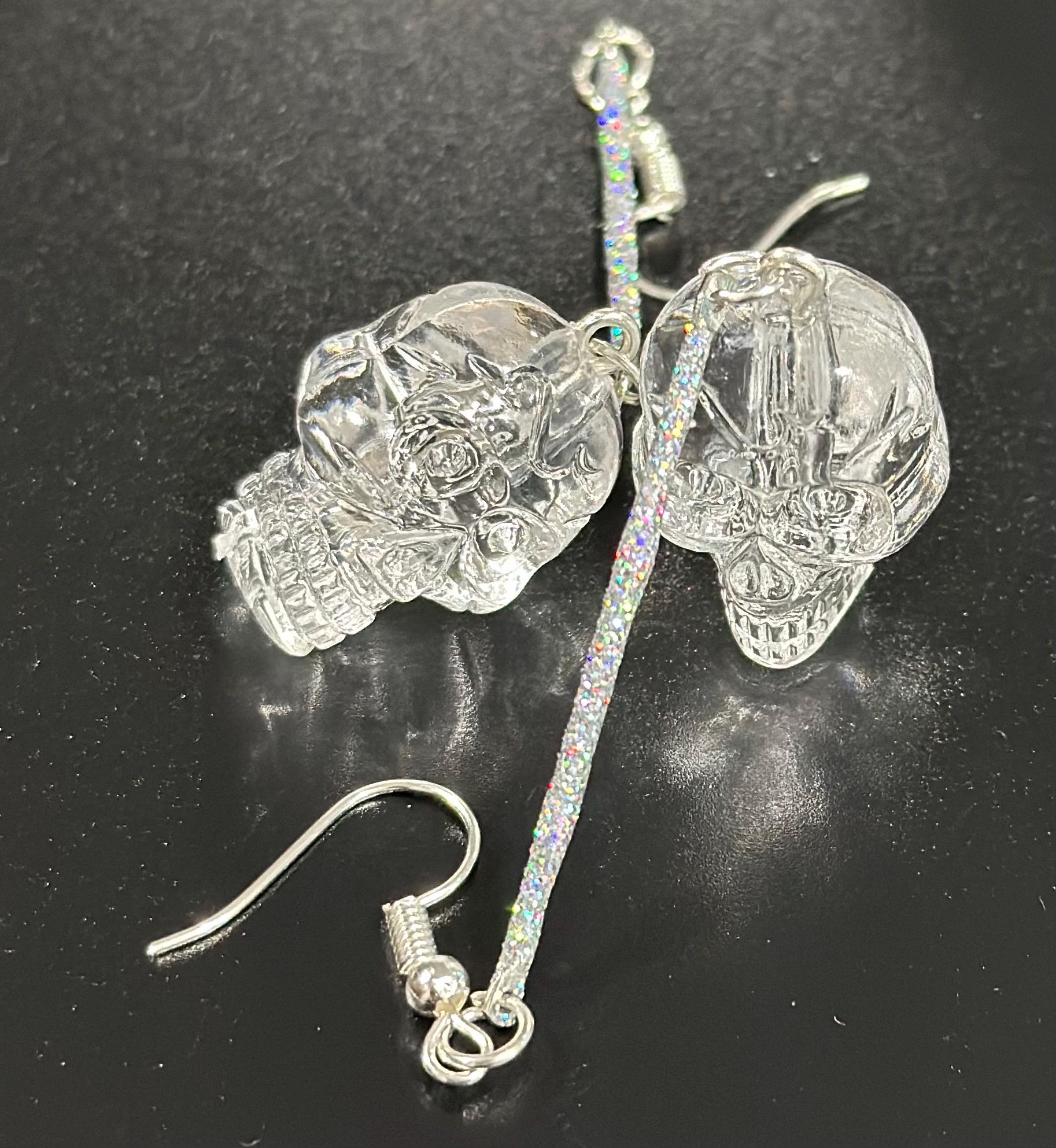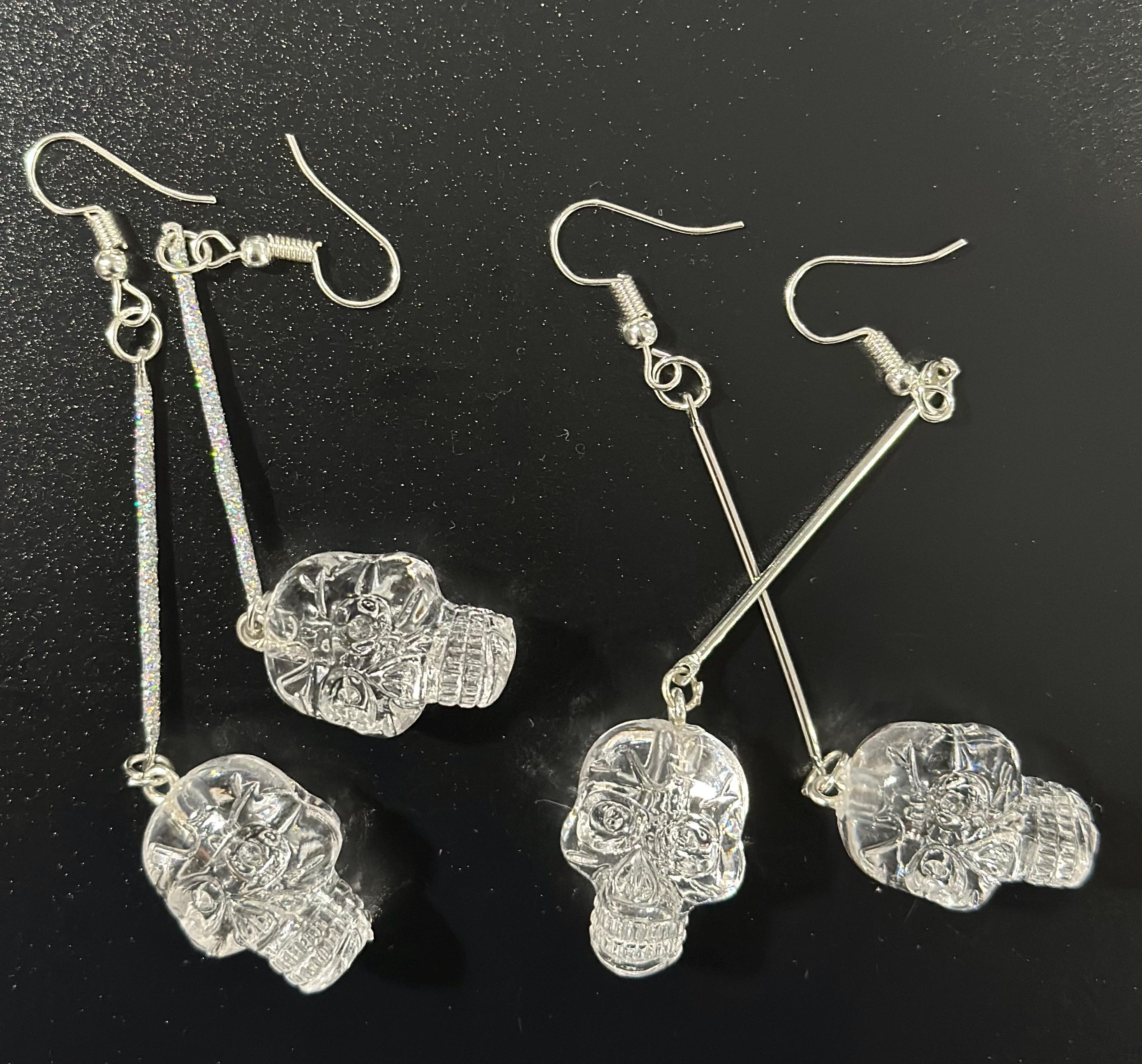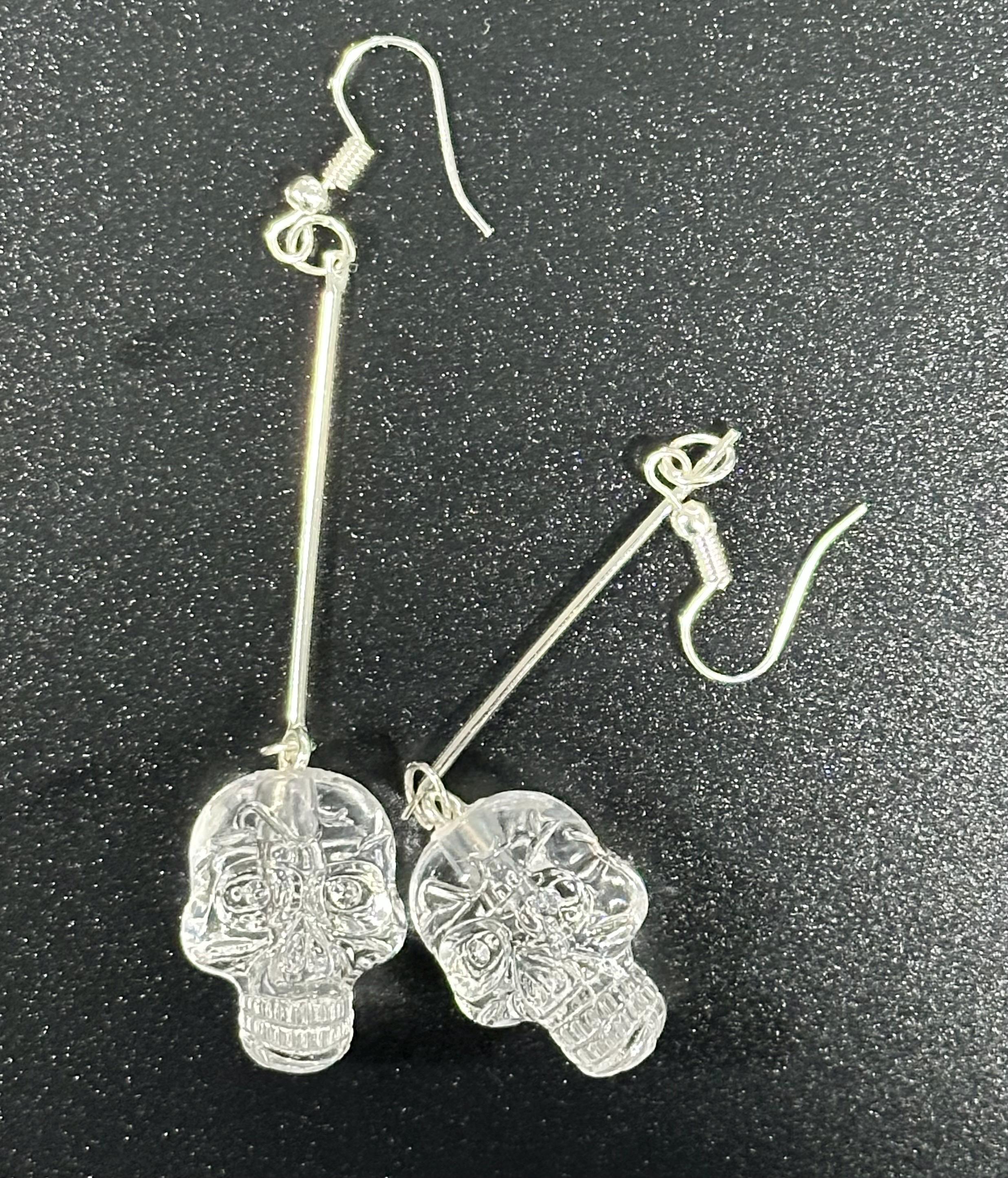 Hand-crafted silver-tone Skull Dangle Earrings featuring intricate clear skull charms suspended from slender silver bar or glitter bar. Subtle enough for everyday elegance, bold enough to elevate festival looks. Perfect Gothic Halloween jewelry for fans of statement earrings, punk Goth style, and dark chic outfits.