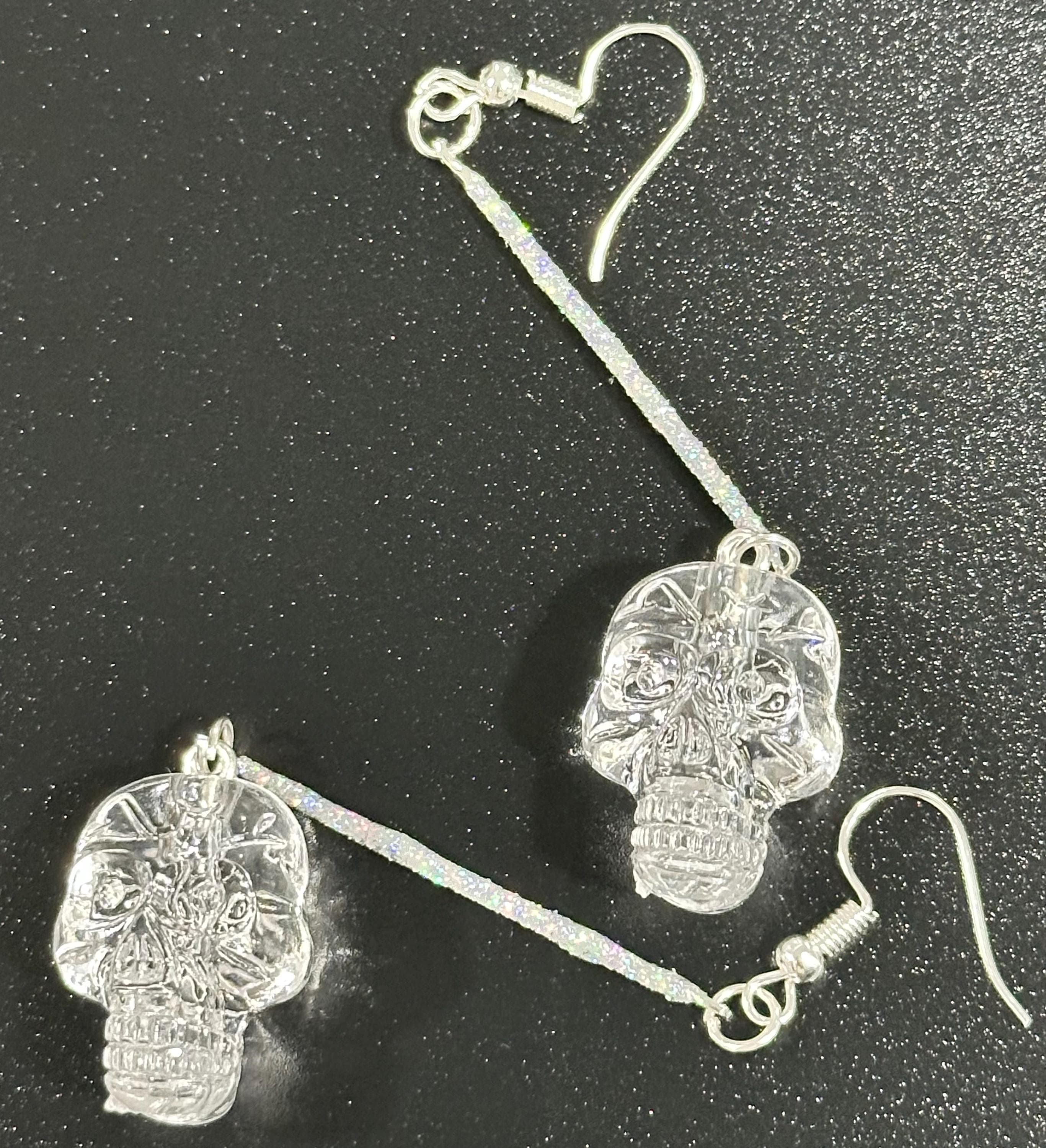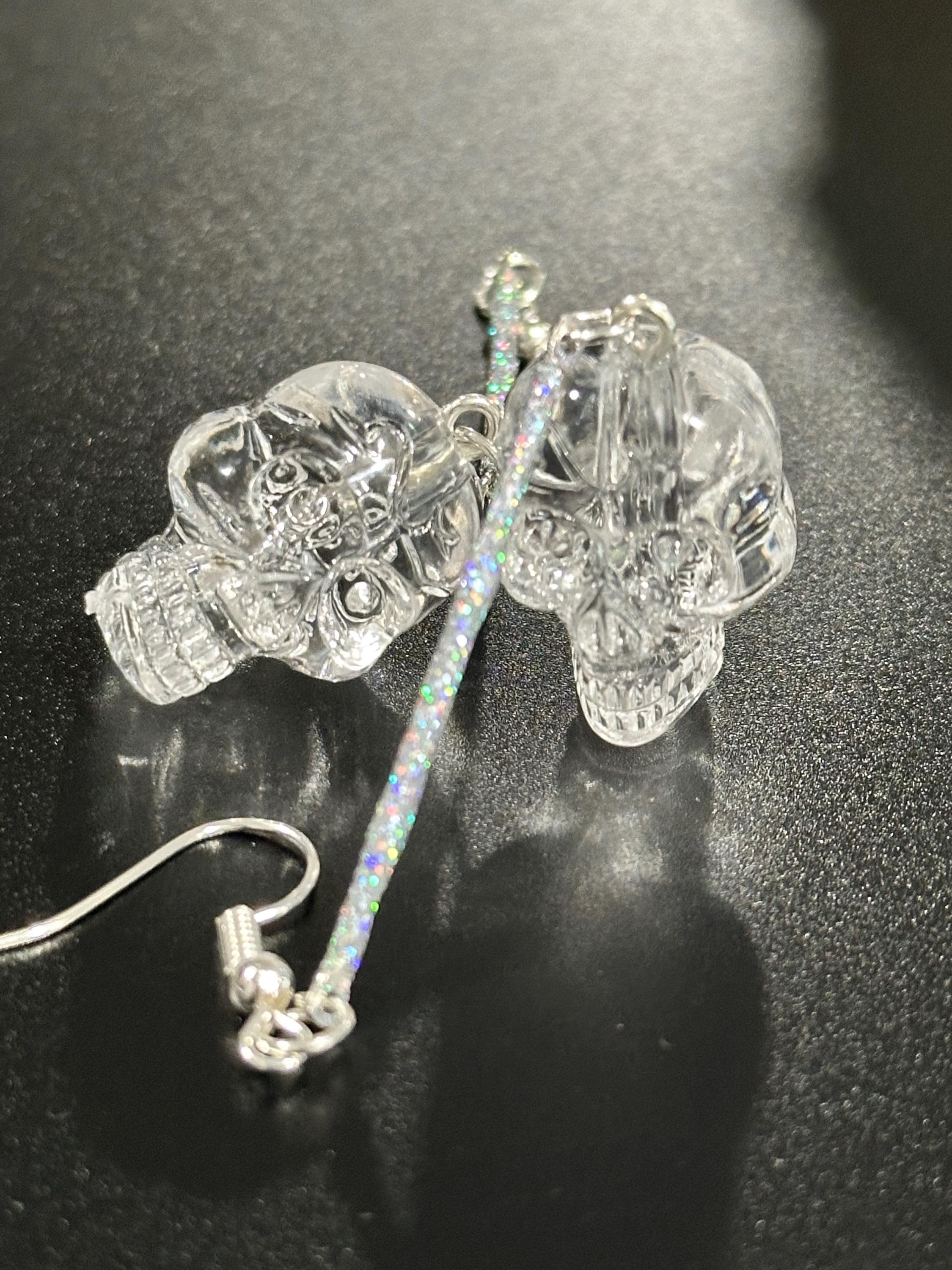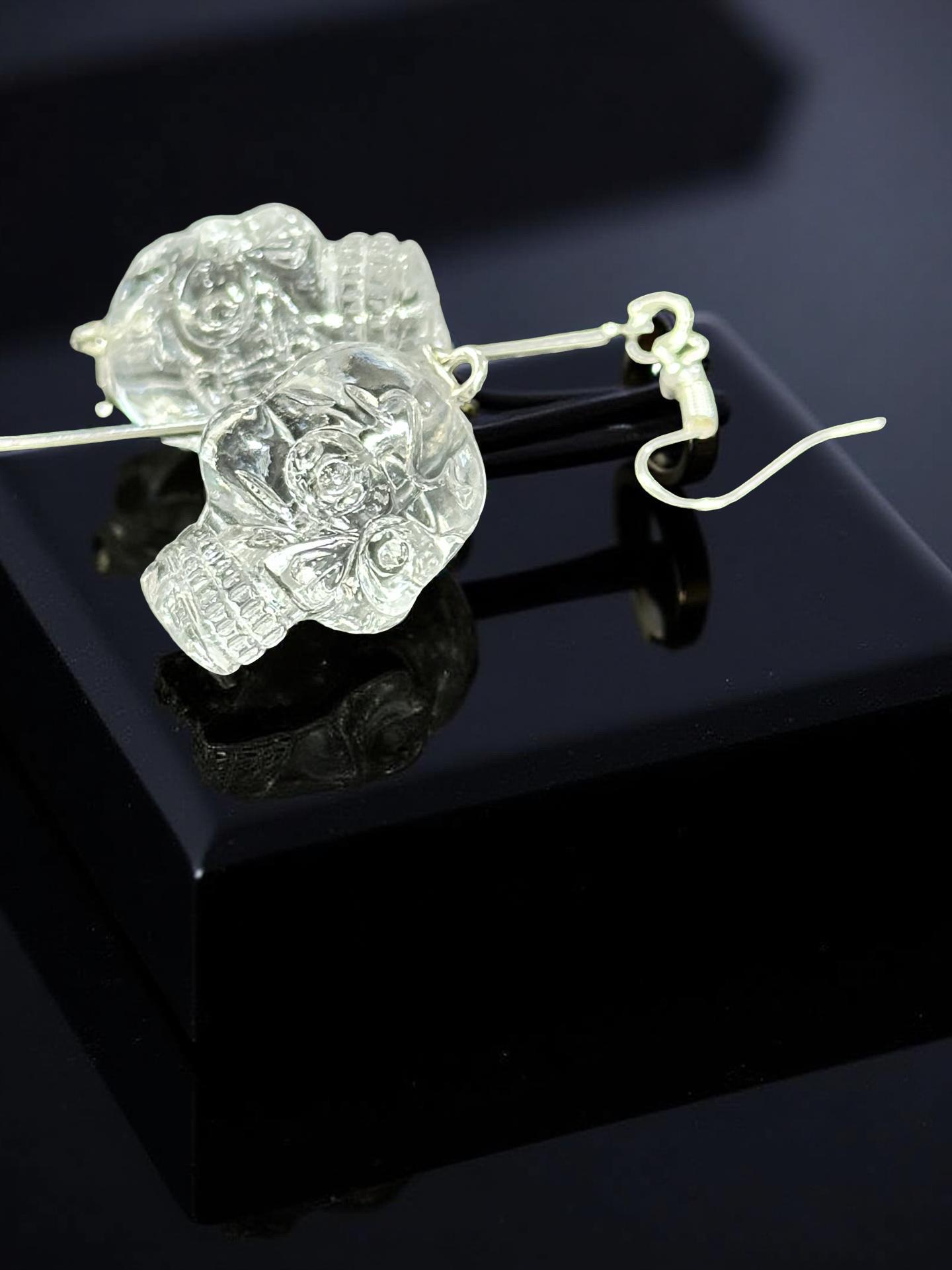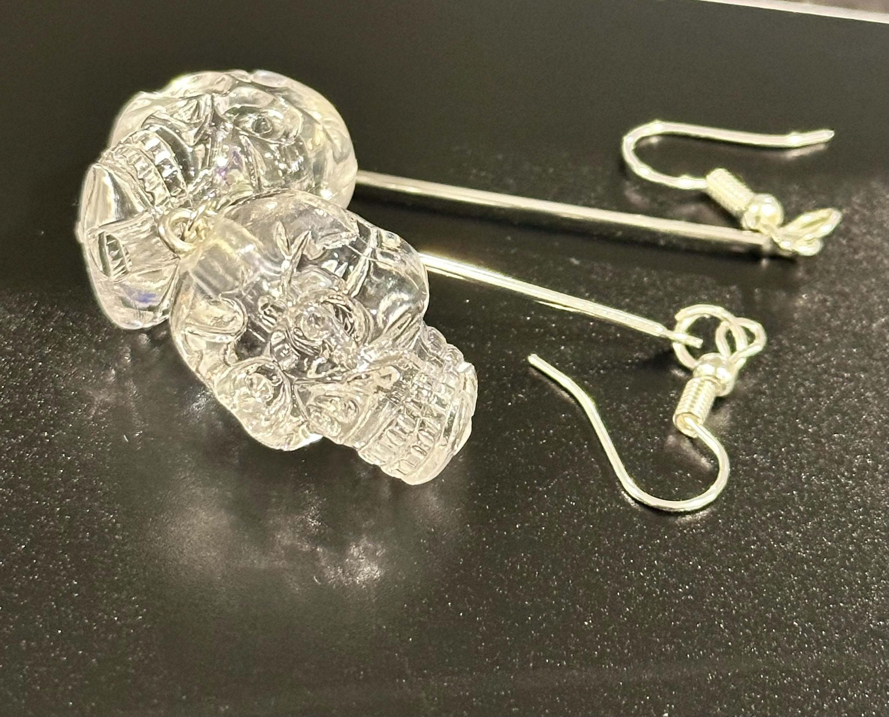 Hand-crafted silver-tone Skull Dangle Earrings featuring intricate clear skull charms suspended from slender silver bar or glitter bar. Subtle enough for everyday elegance, bold enough to elevate festival looks. Perfect Gothic Halloween jewelry for fans of statement earrings, punk Goth style, and dark chic outfits.
