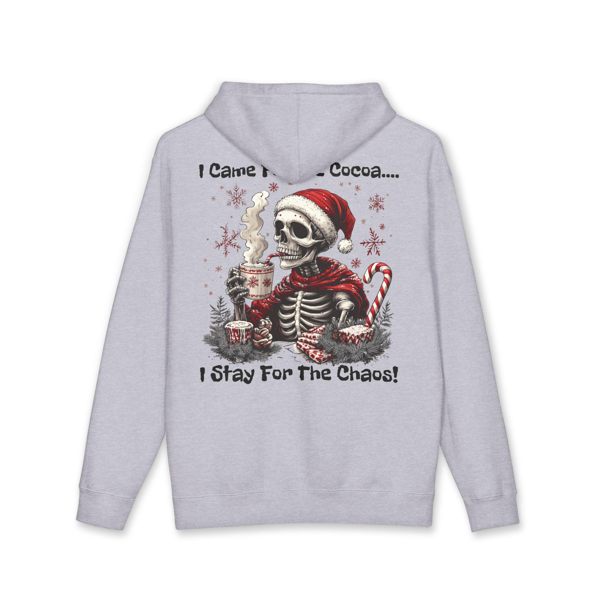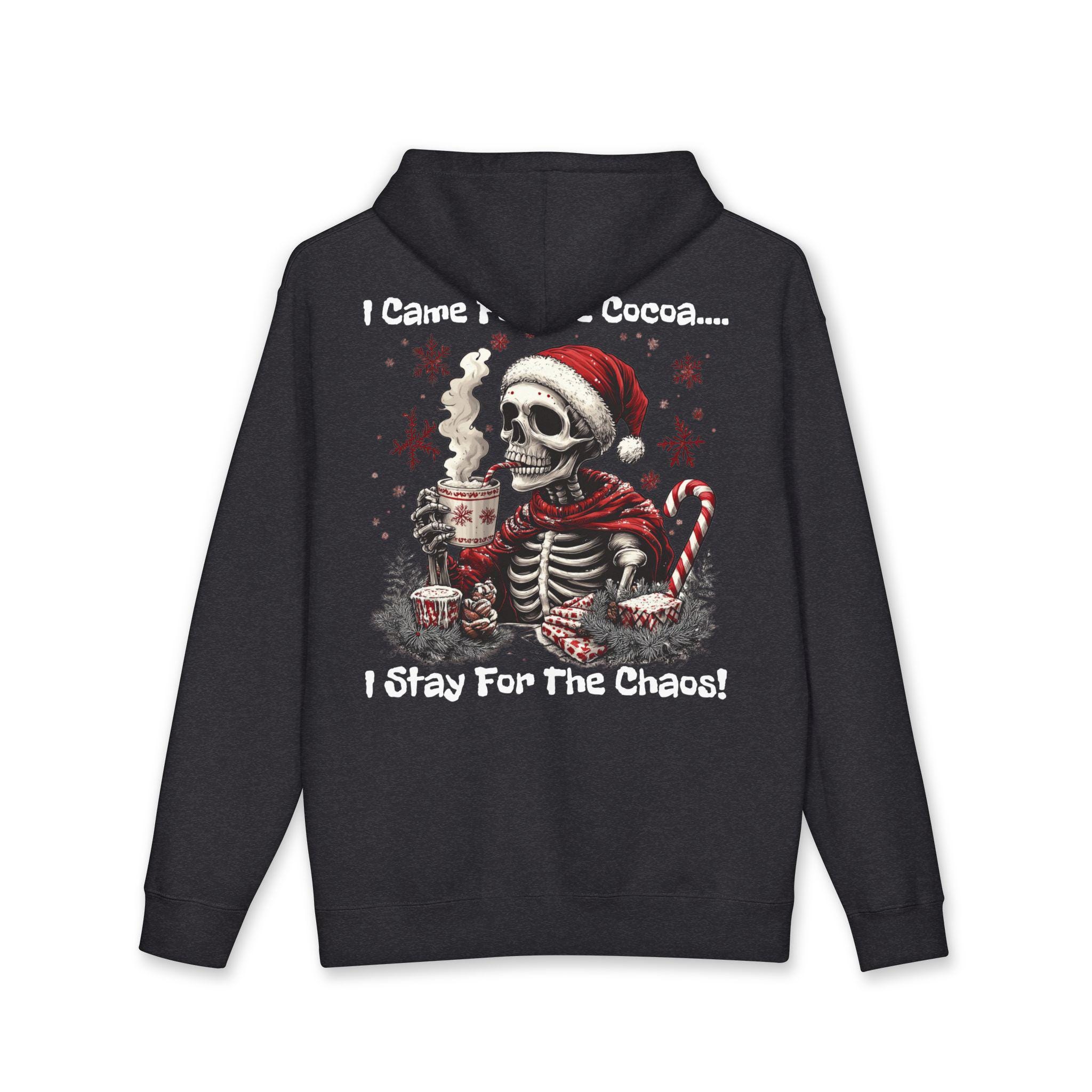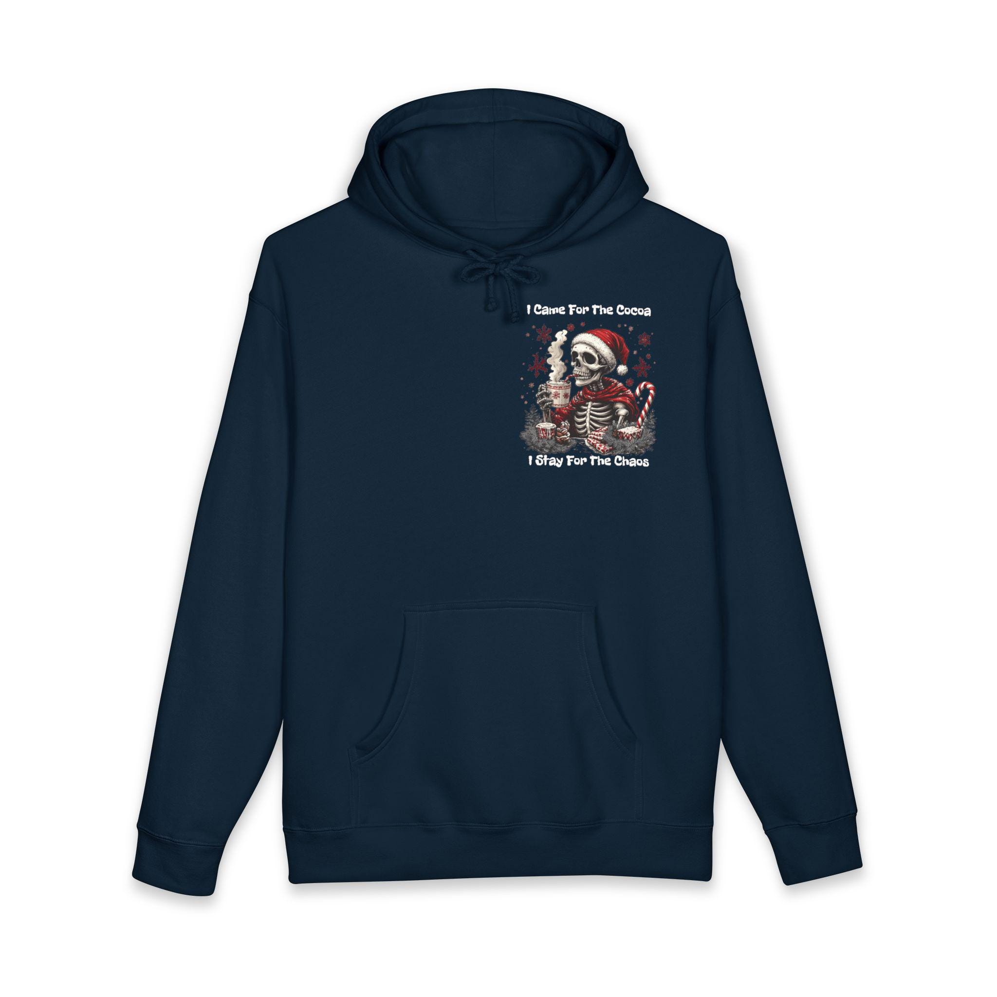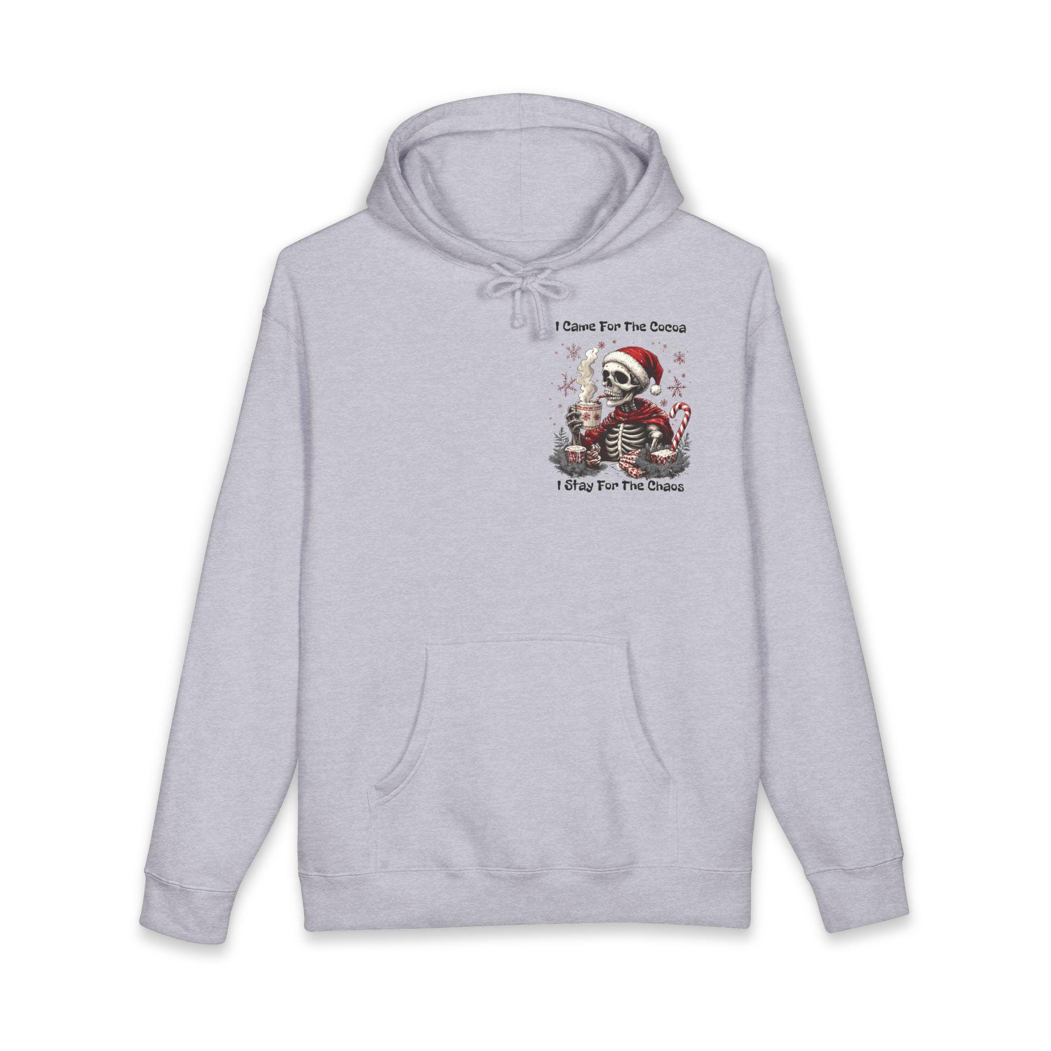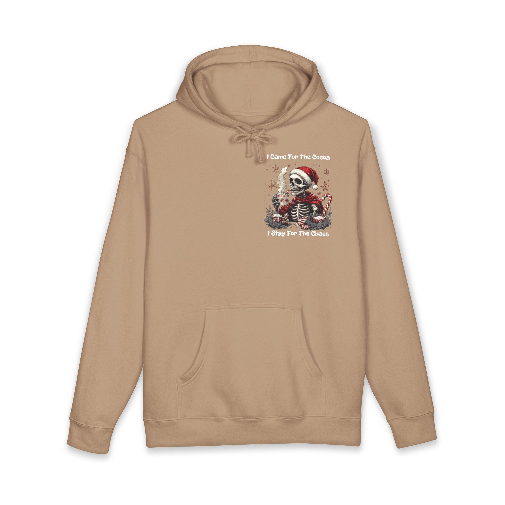 This heavyweight hooded sweatshirt brings a darkly playful twist to winter comfort. Built from a sturdy cotton blend with a cozy fleece-lined hood and roomy, relaxed cut, it wraps you in warmth while showcasing a cheeky seasonal design — a smiling skeleton in a Santa hat clutching a steaming mug, candy cane, and holiday treats, captioned “I Came For The Cocoa... I Stay For The Chaos!” The ribbed cuffs and waistband keep heat in, and the tear-away label keeps the neck irritation-free. Wear it on chilly nights by the fire, at rowdy holiday get-togethers, or whenever you want comfort with a side of wicked humor.