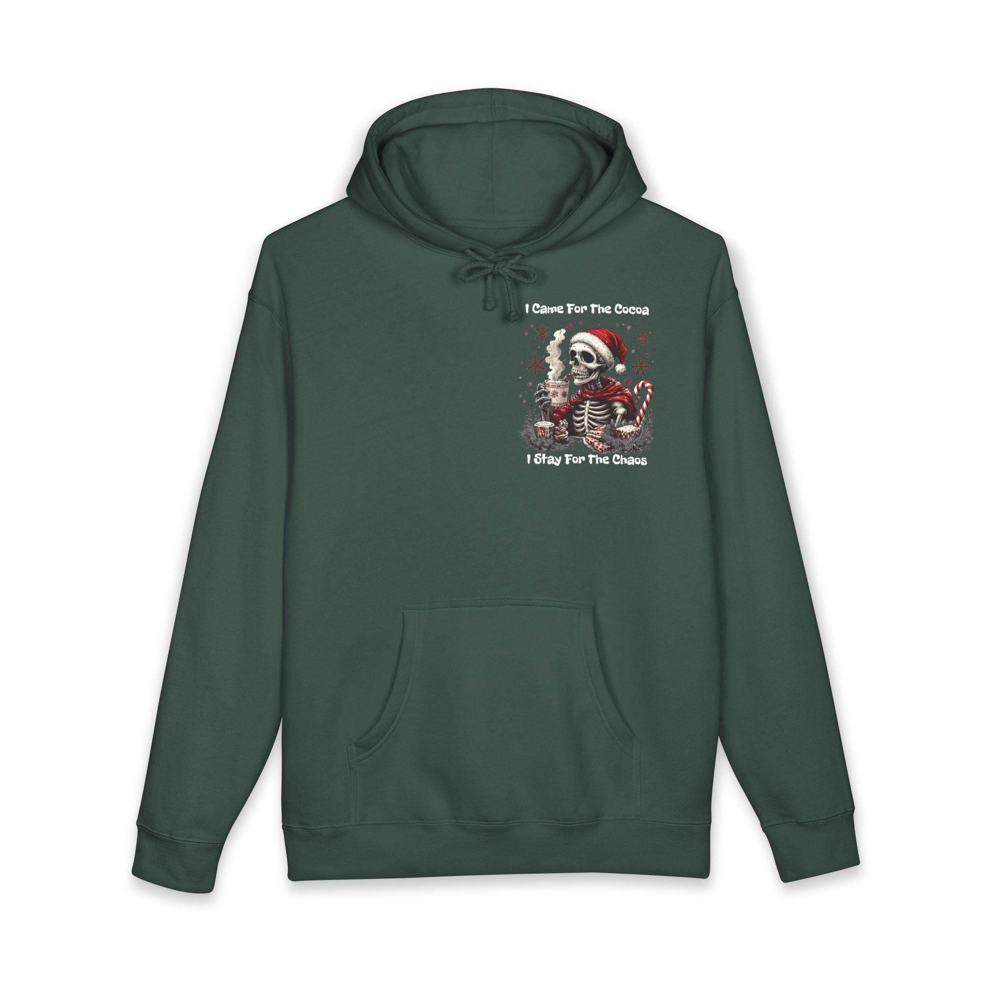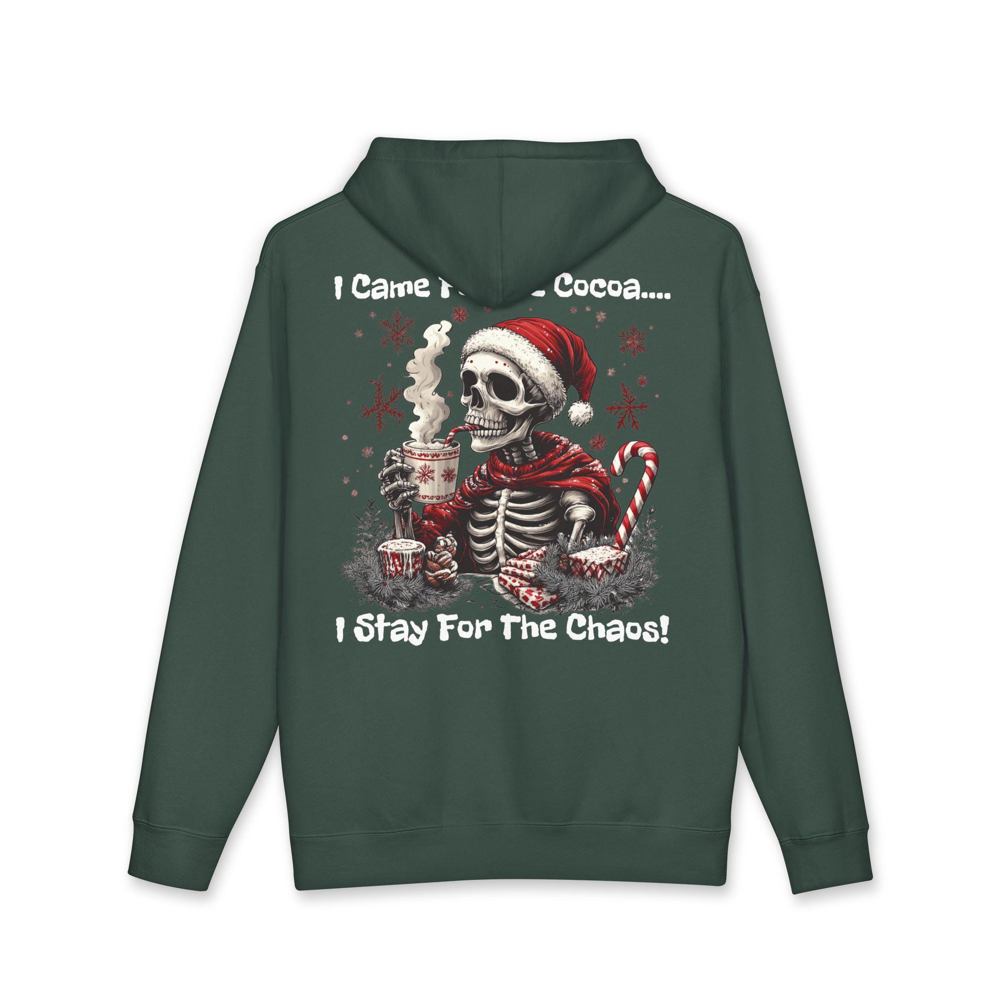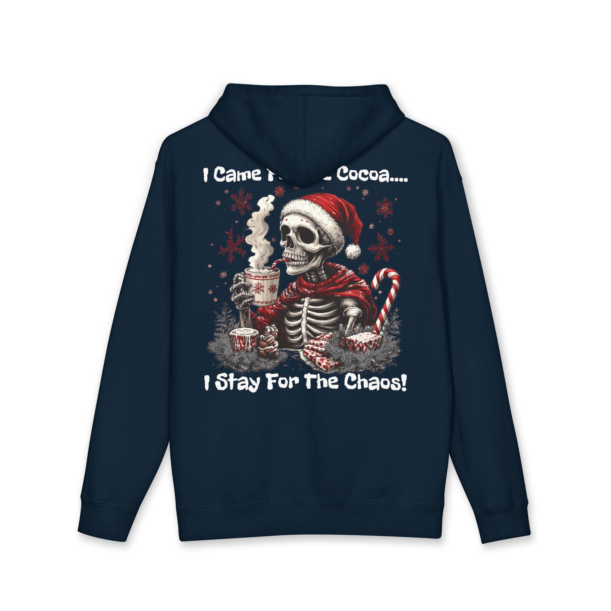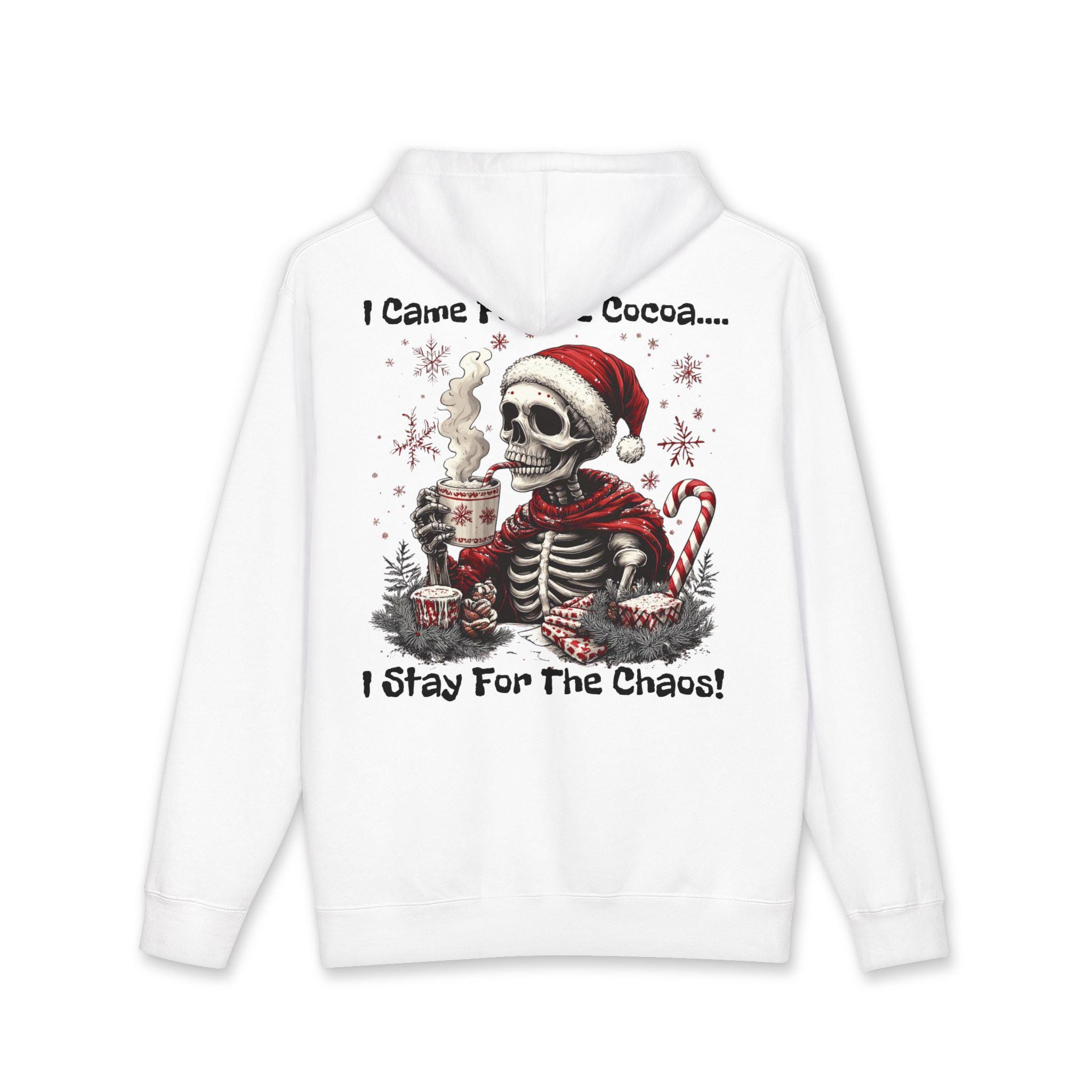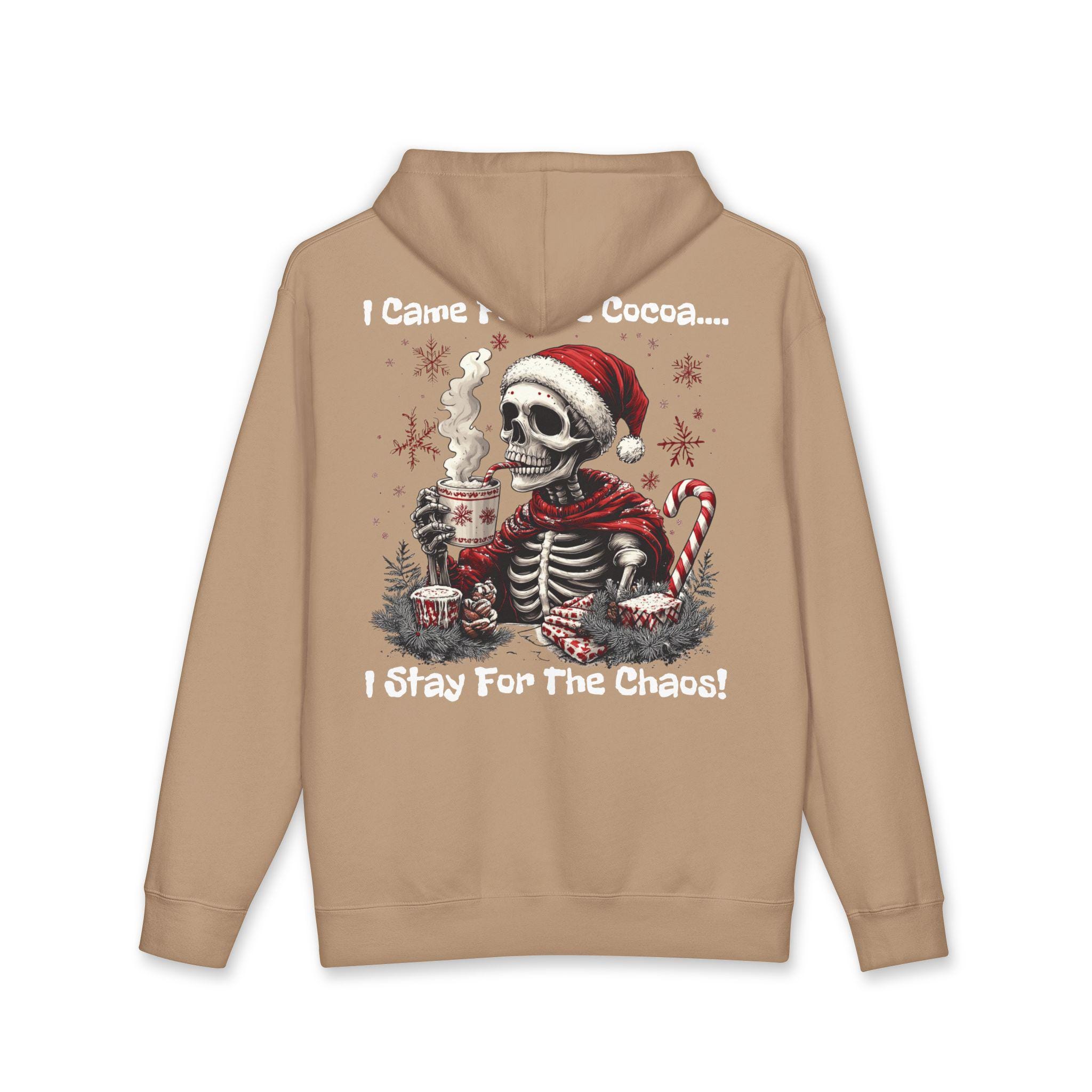 This heavyweight hooded sweatshirt brings a darkly playful twist to winter comfort. Built from a sturdy cotton blend with a cozy fleece-lined hood and roomy, relaxed cut, it wraps you in warmth while showcasing a cheeky seasonal design — a smiling skeleton in a Santa hat clutching a steaming mug, candy cane, and holiday treats, captioned “I Came For The Cocoa... I Stay For The Chaos!” The ribbed cuffs and waistband keep heat in, and the tear-away label keeps the neck irritation-free. Wear it on chilly nights by the fire, at rowdy holiday get-togethers, or whenever you want comfort with a side of wicked humor.