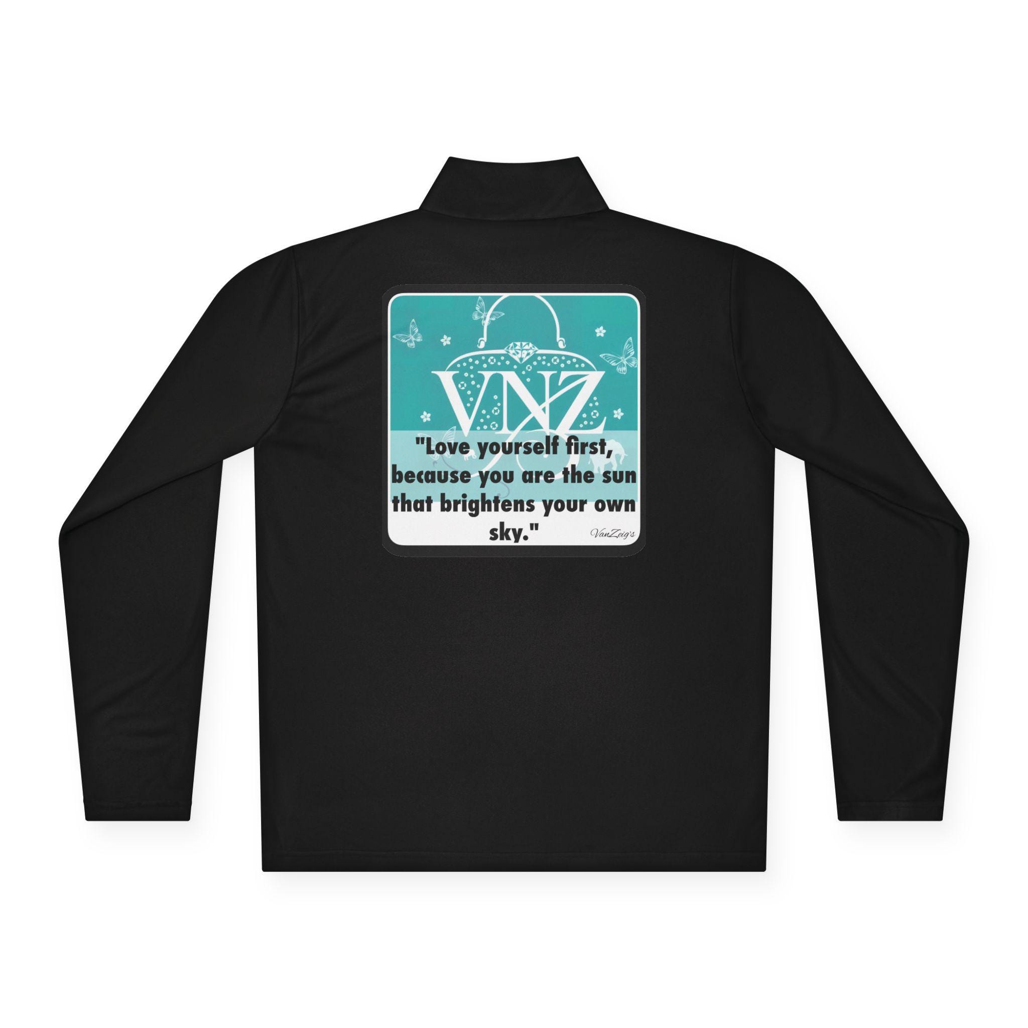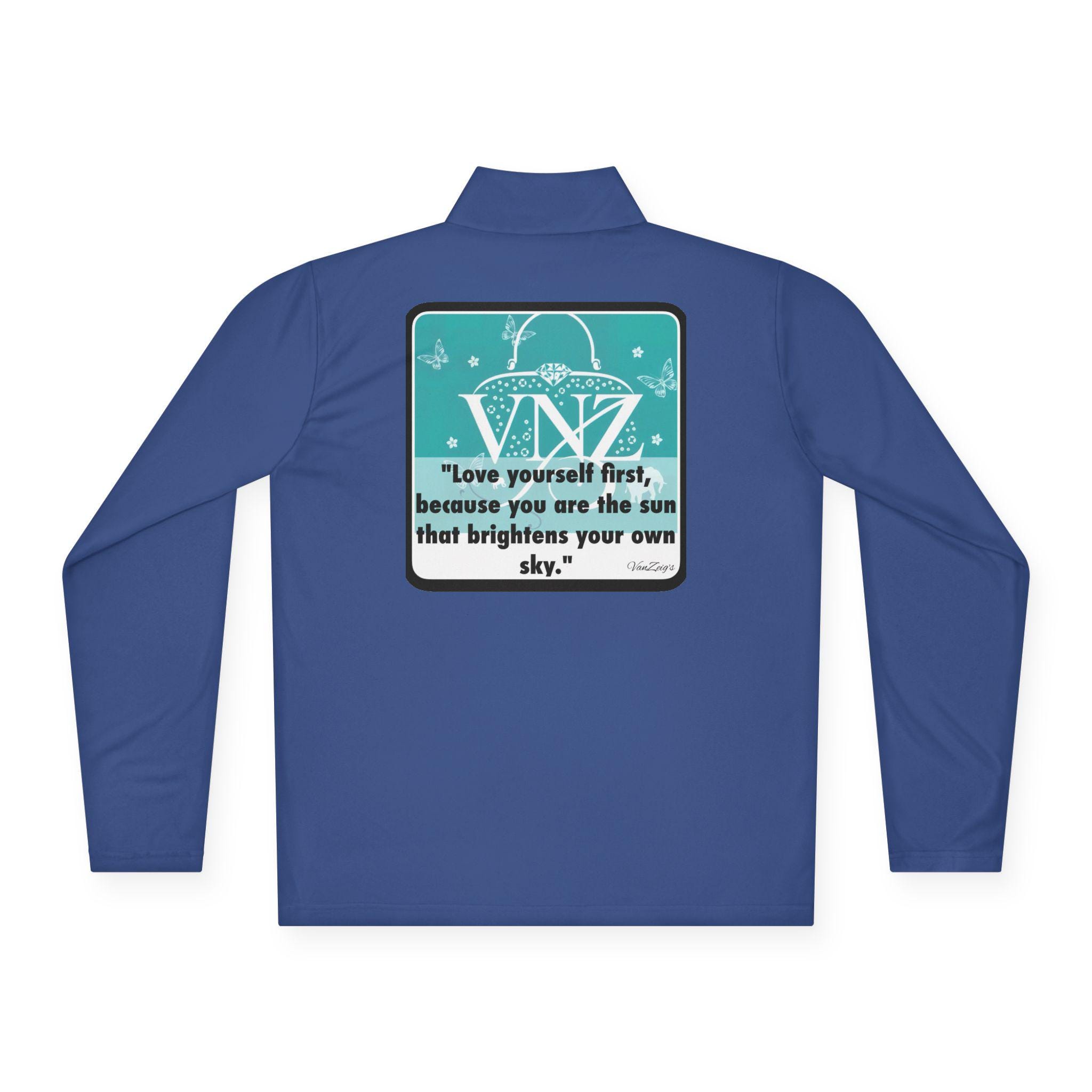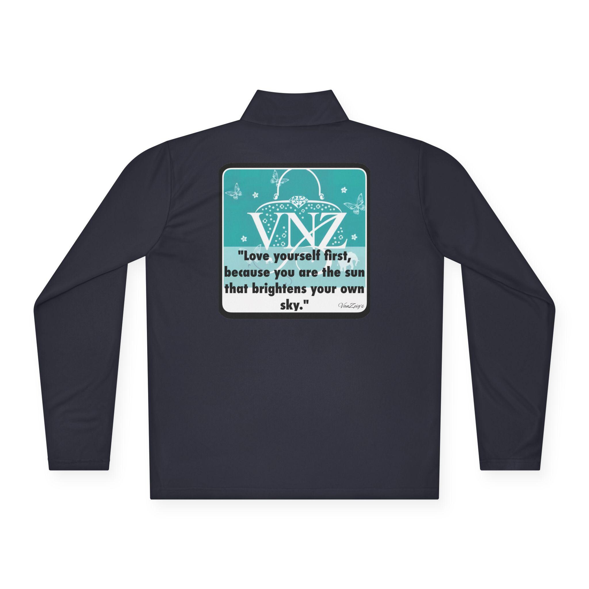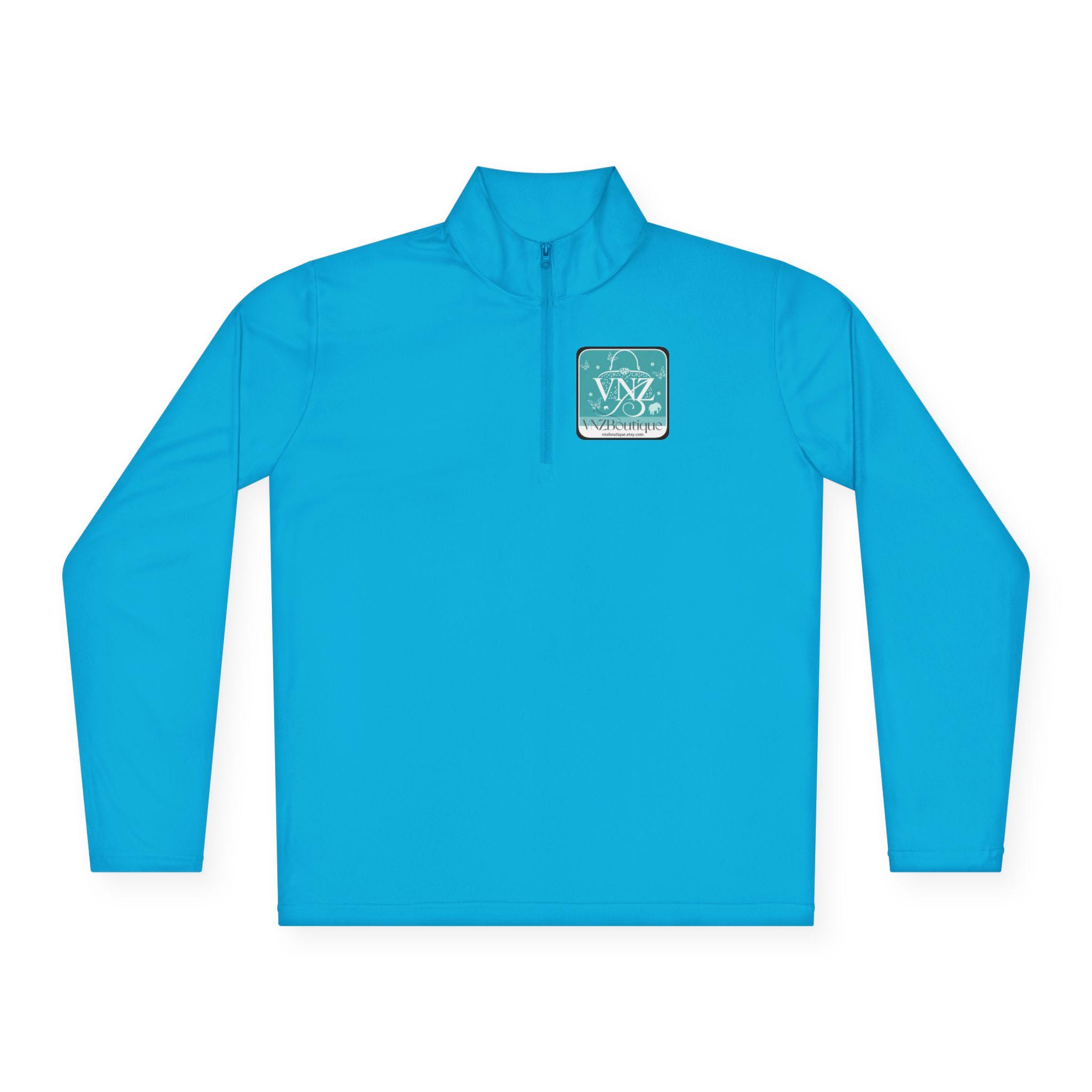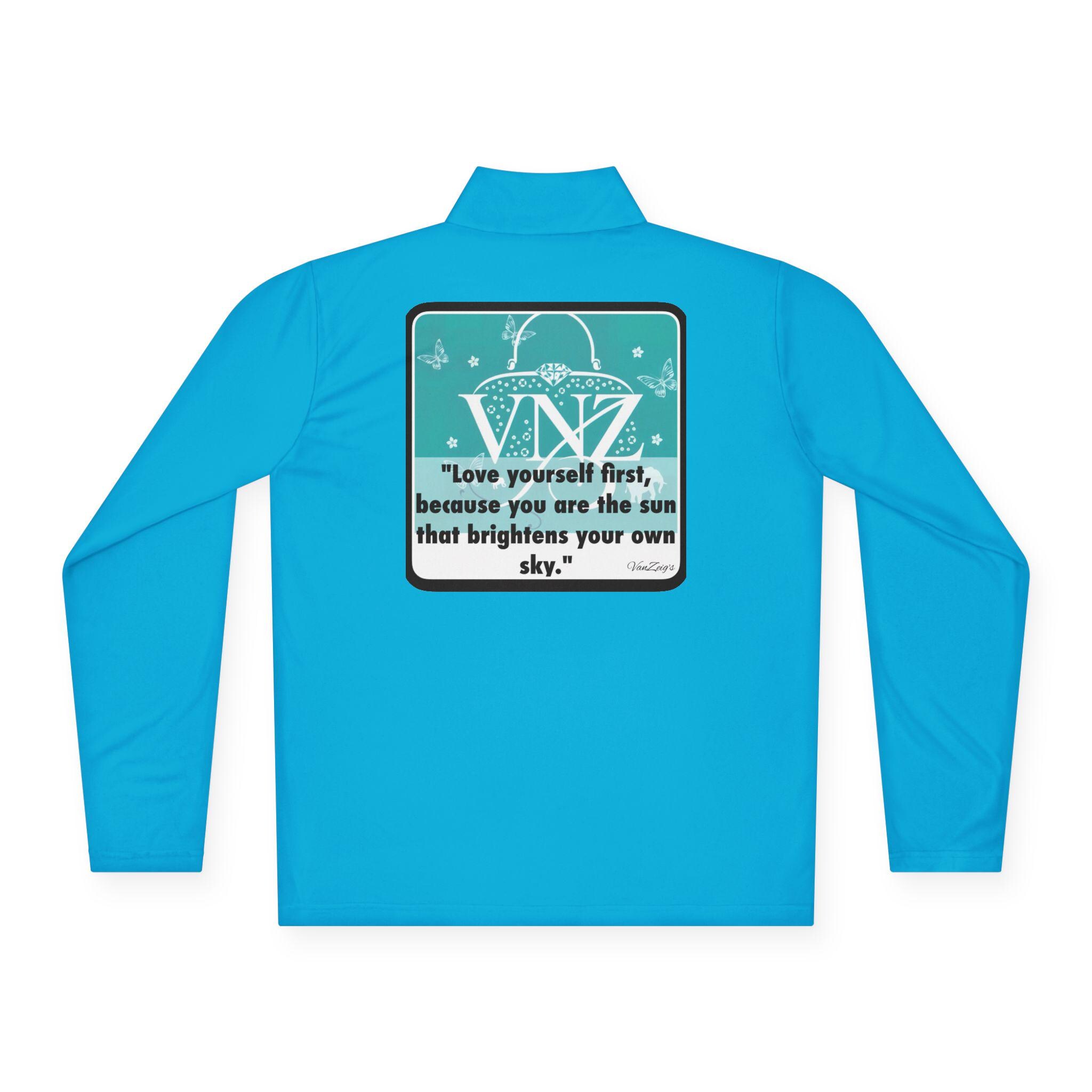 VNZ Logo & Quote quarter-zip pullover | teal sunburst inspirational design