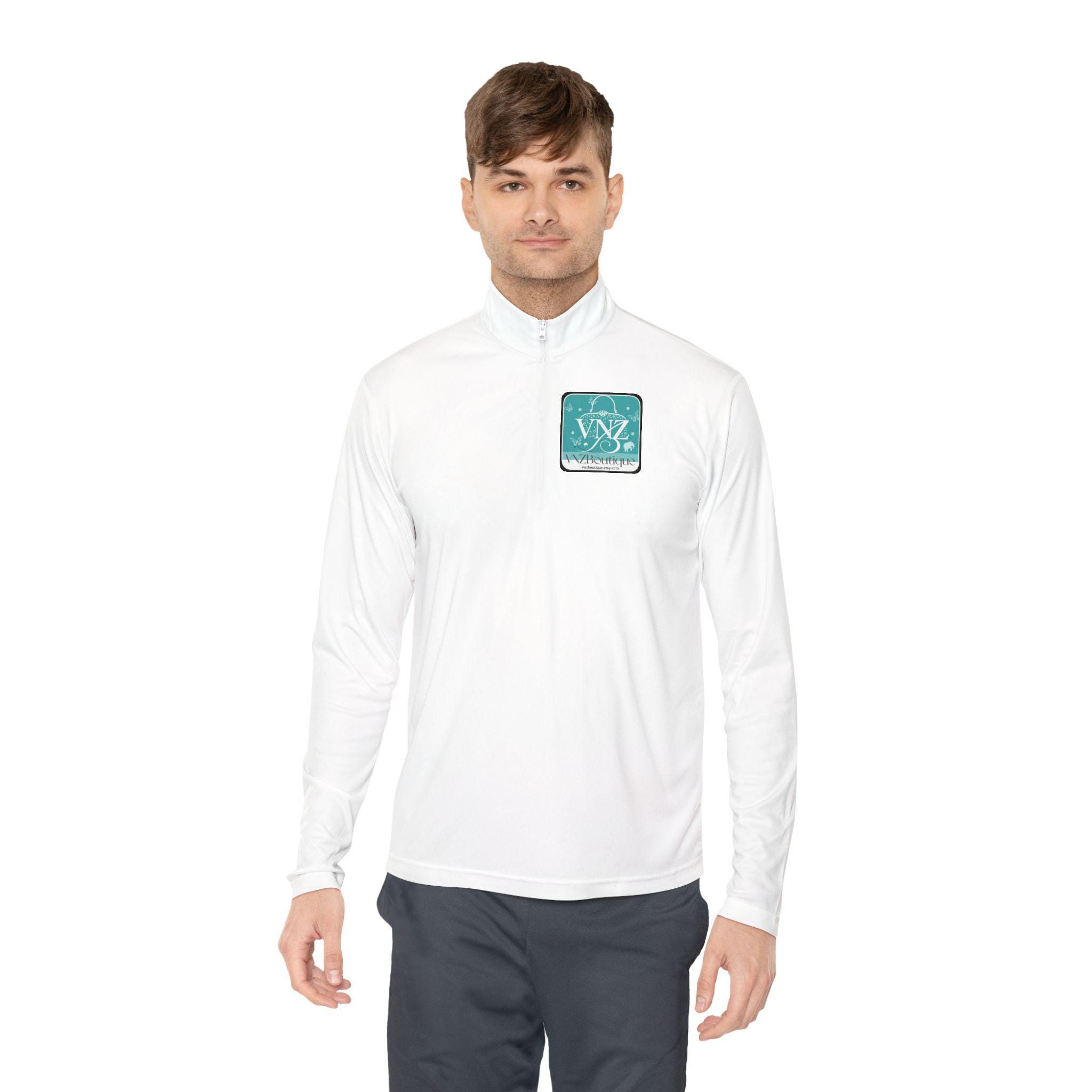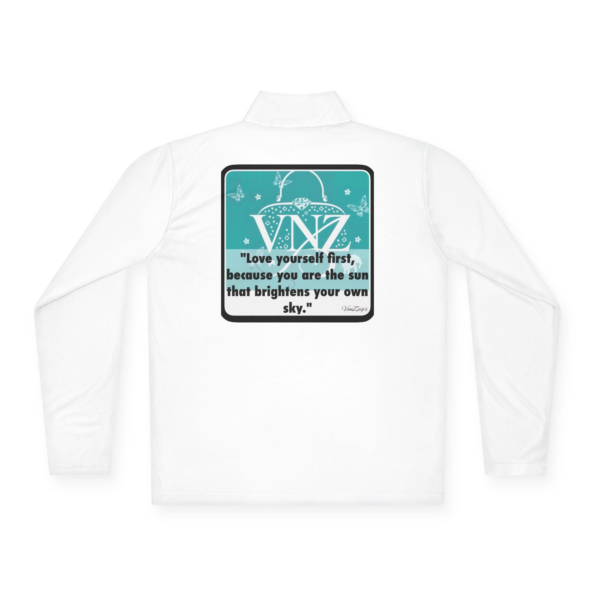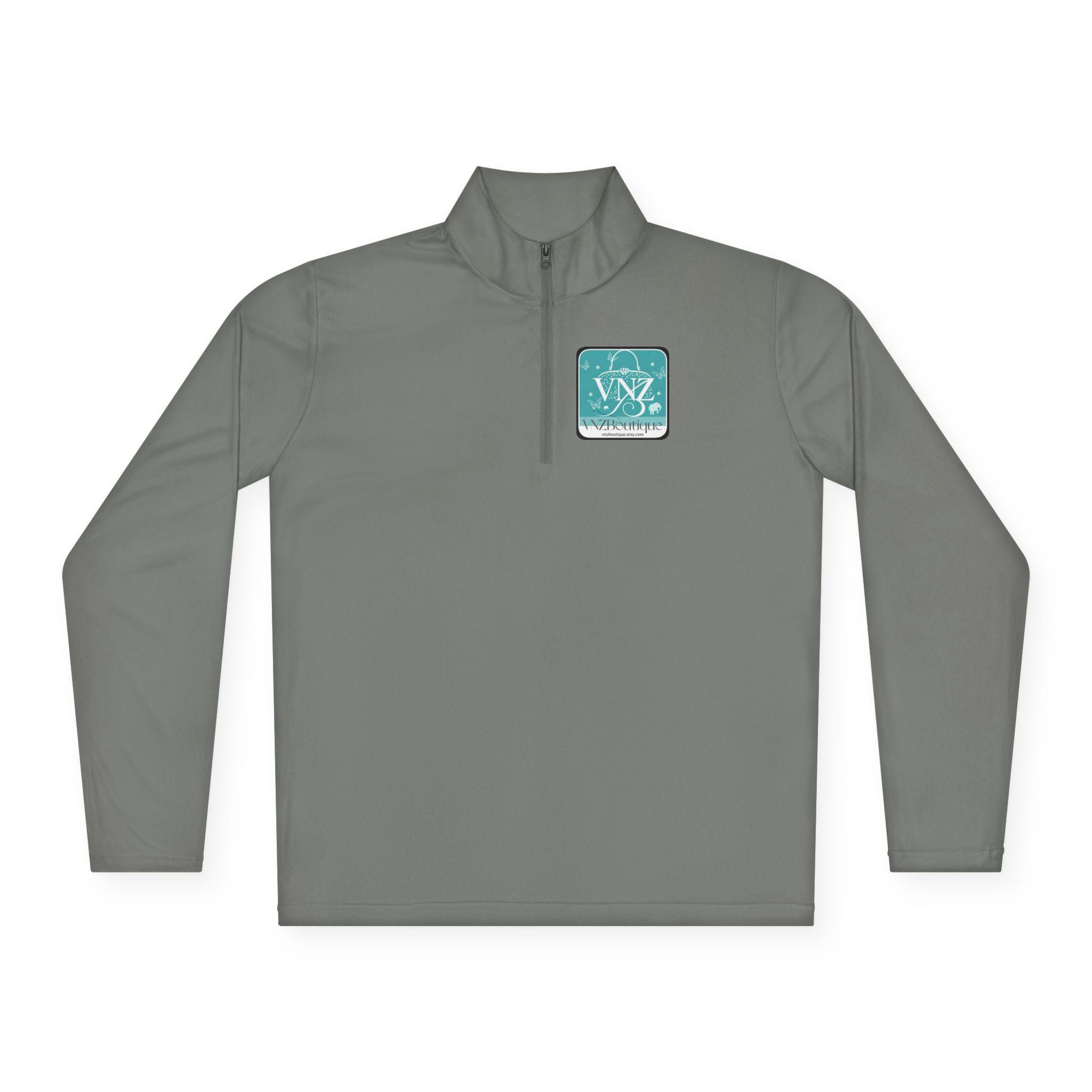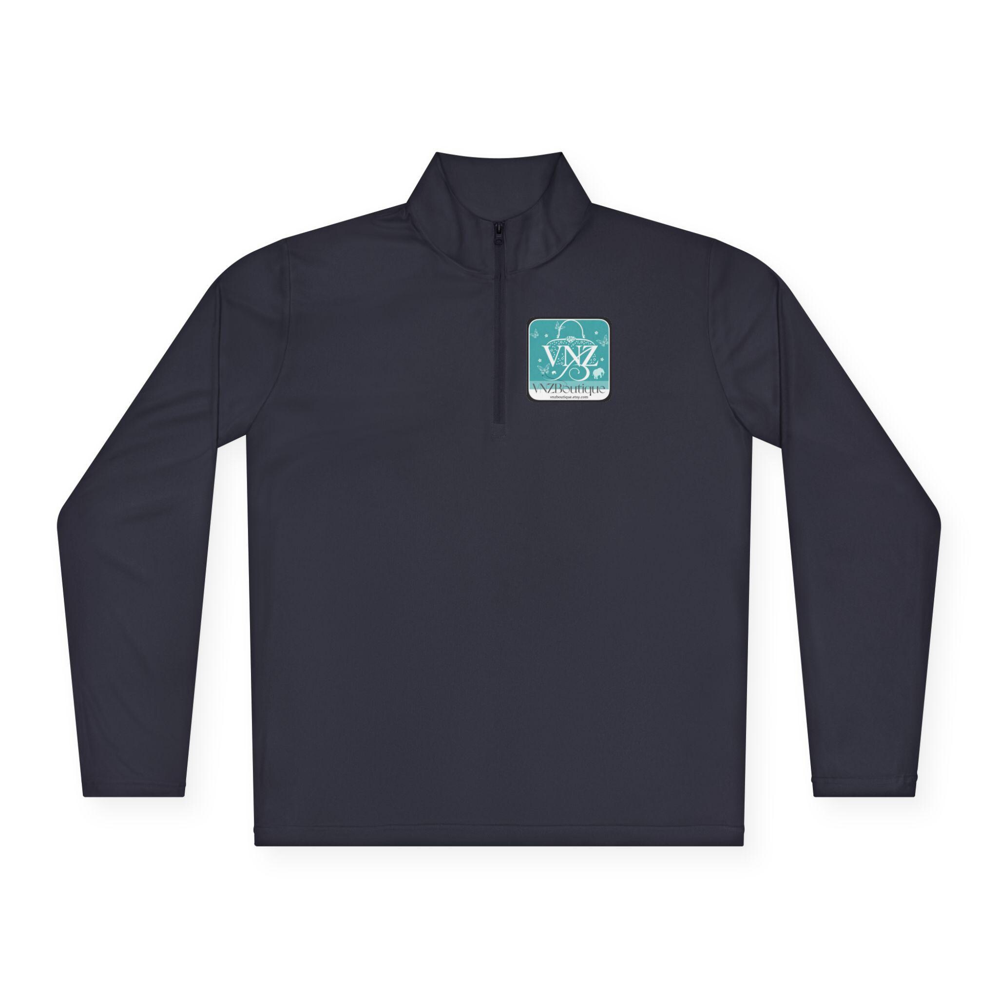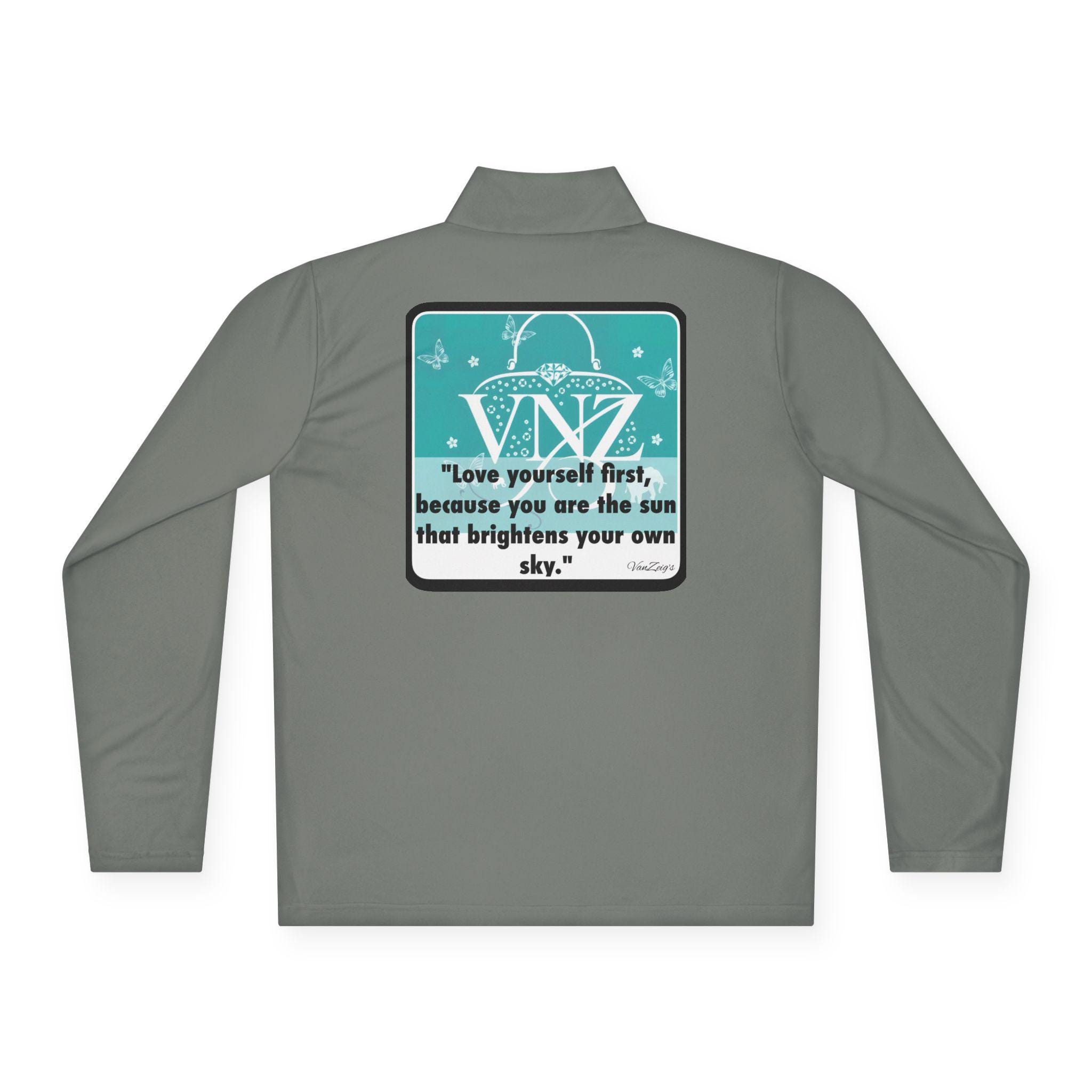 VNZ Logo & Quote quarter-zip pullover | teal sunburst inspirational design