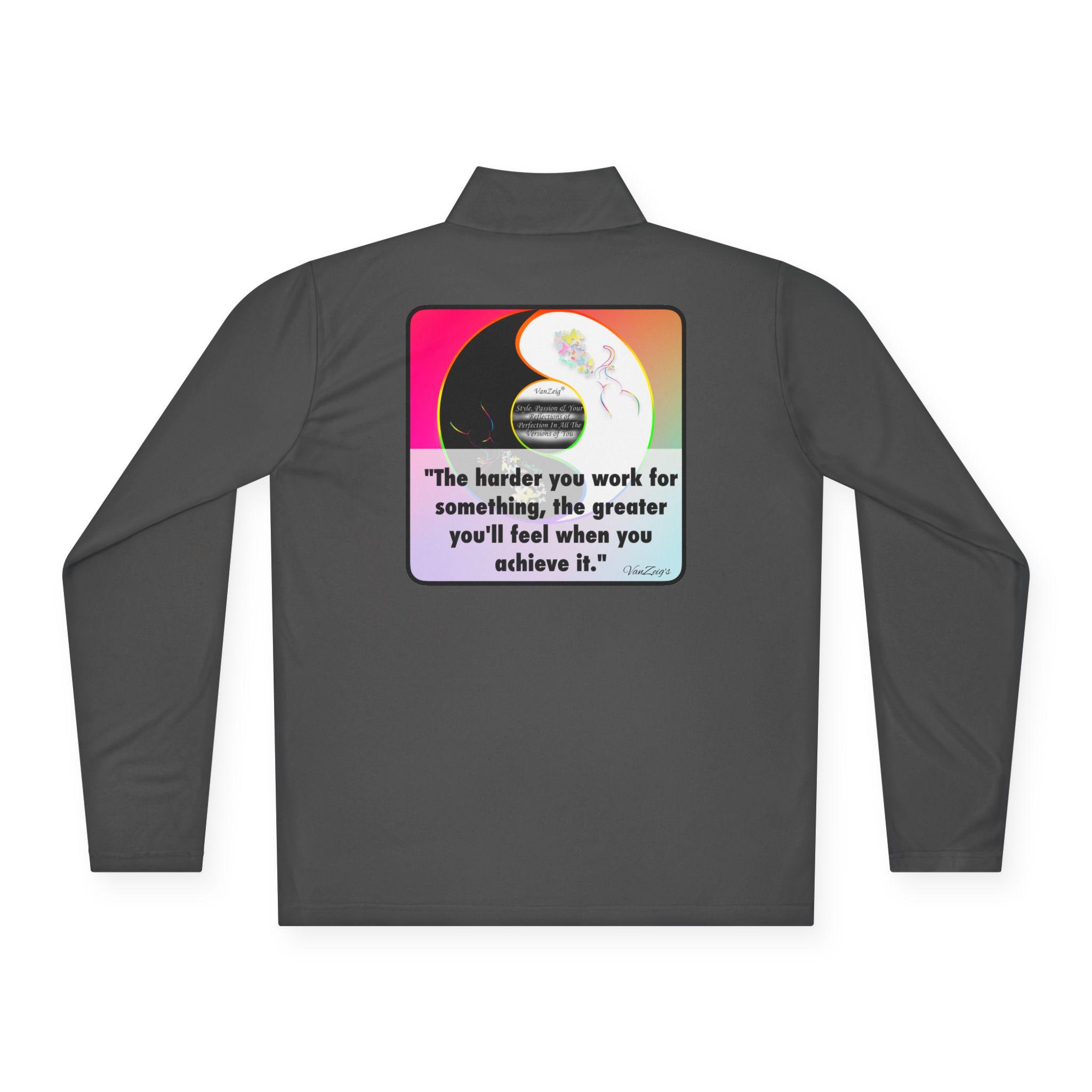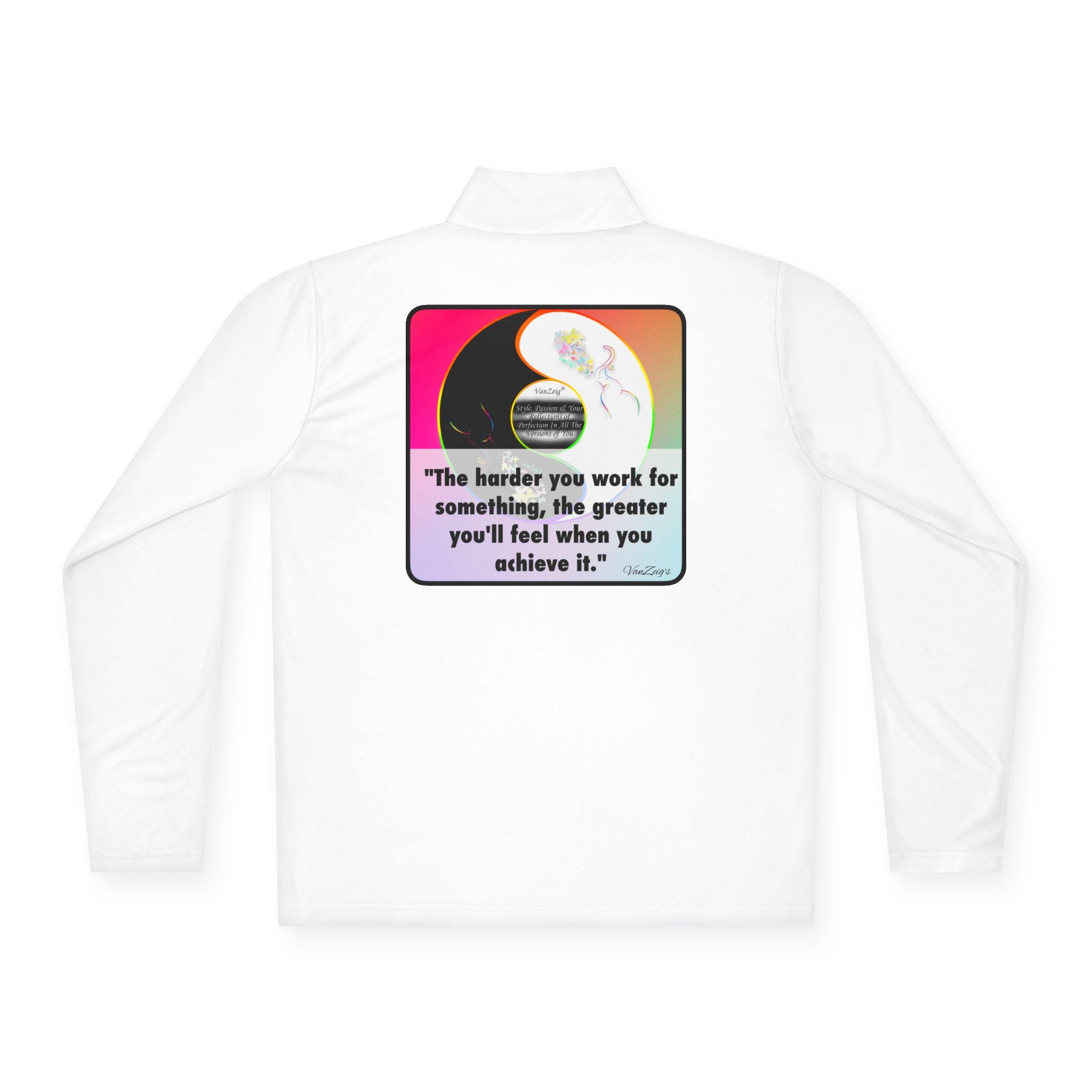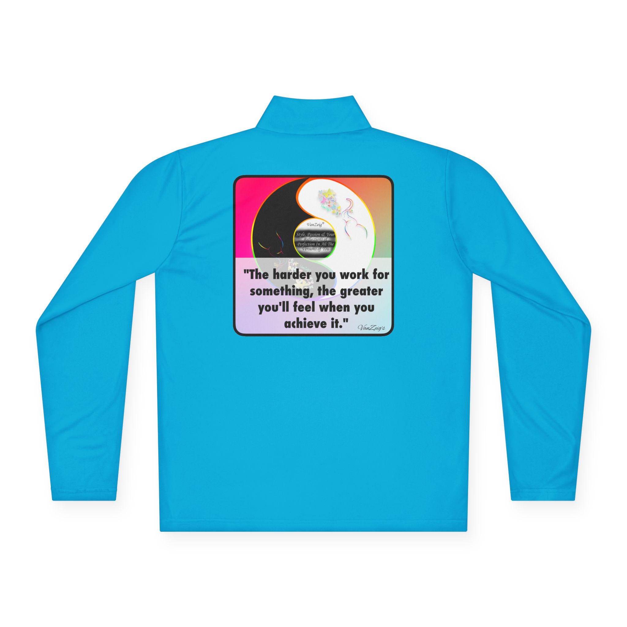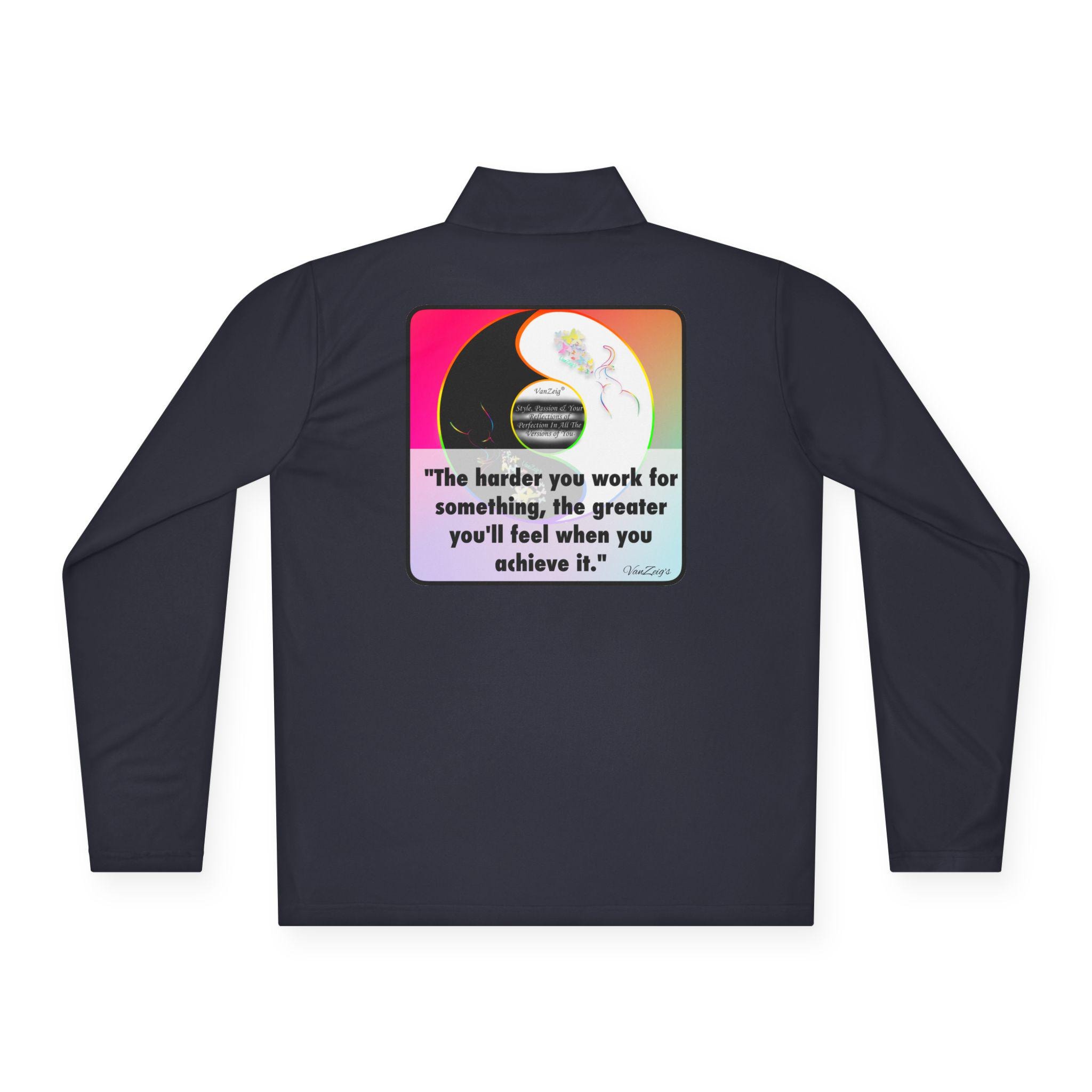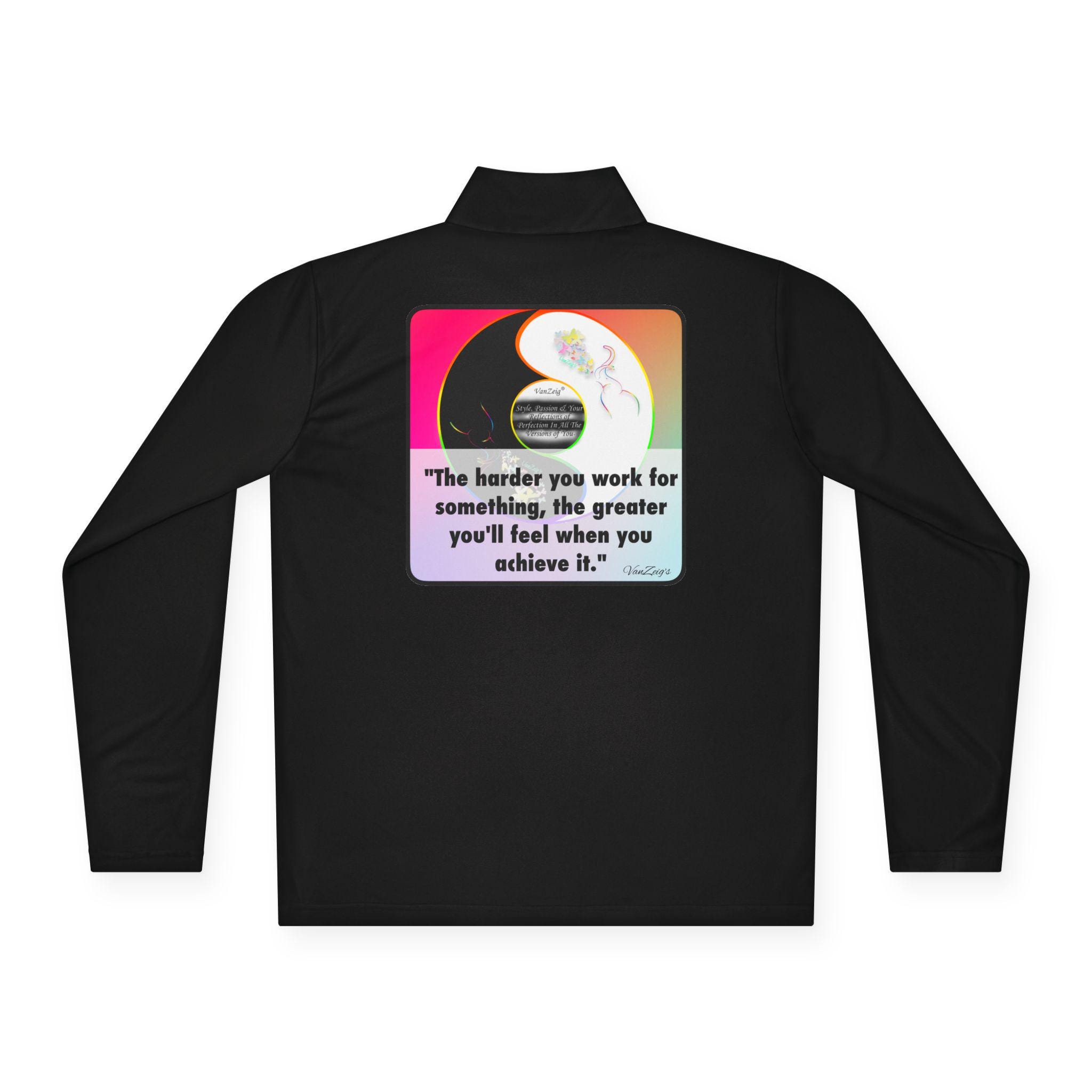 VanZeig's Logo & Quote pullover featuring a colorful Yin Yang inspirational design, perfect for those seeking a lightweight and uplifting piece of clothing. This quarter-zip pullover offers breathable comfort, moisture-wicking fabric, and a clean cadet collar for neck coverage. The subtle printed emblem and larger graphic provide a gentle reminder to slow down and remember your worth, making it ideal for morning walks, travel days, or low-impact workouts. Relevant for individuals looking for comfort and support in movement and mood.