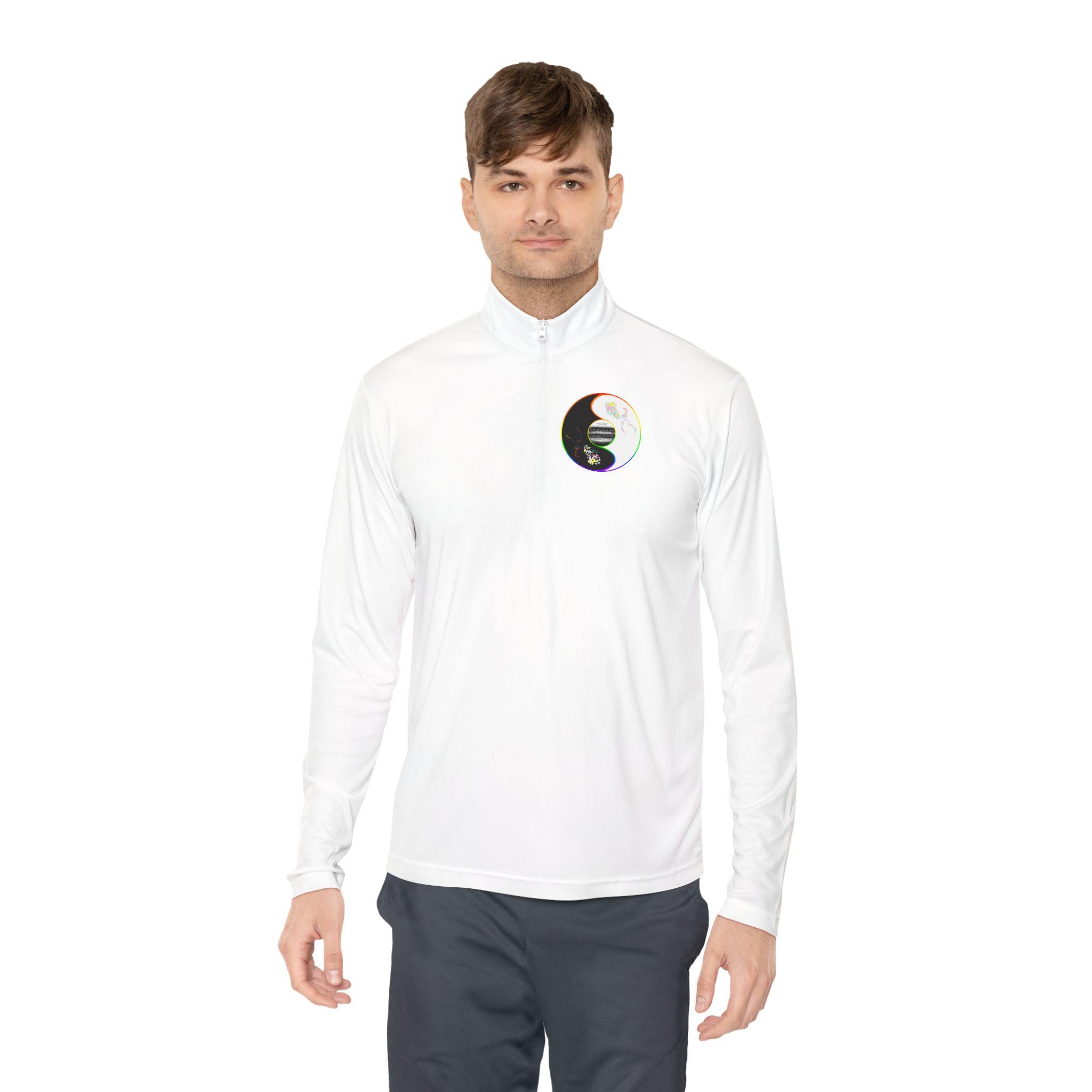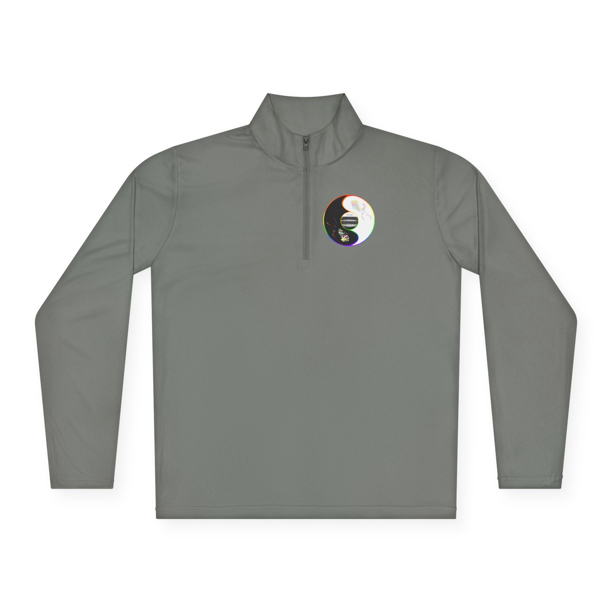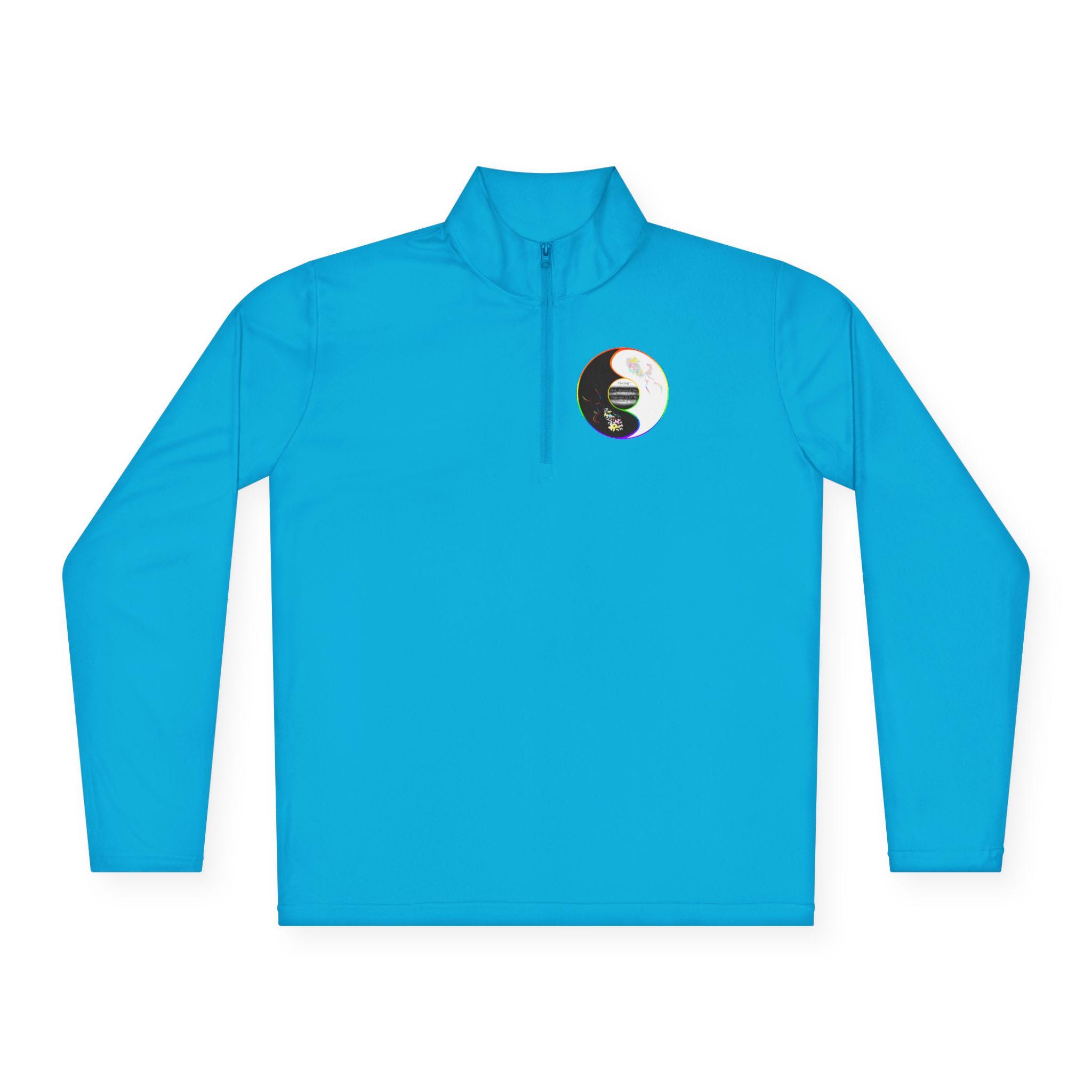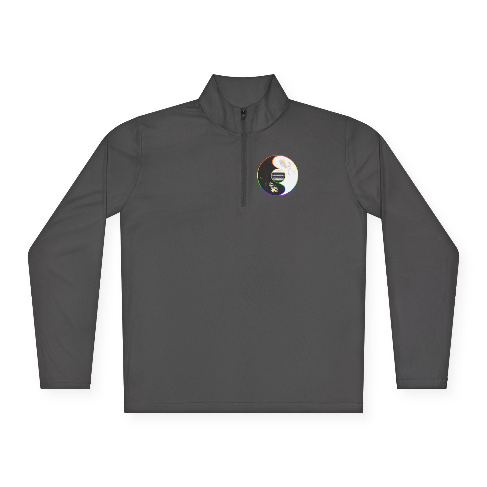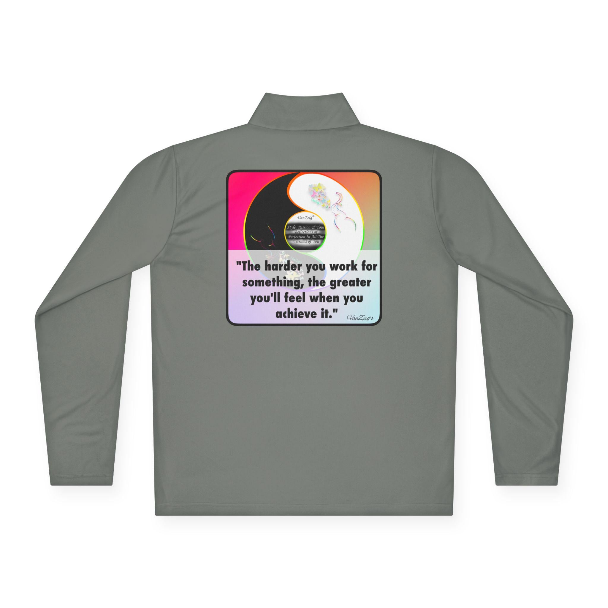 VanZeig's Logo & Quote pullover featuring a colorful Yin Yang inspirational design, perfect for those seeking a lightweight and uplifting piece of clothing. This quarter-zip pullover offers breathable comfort, moisture-wicking fabric, and a clean cadet collar for neck coverage. The subtle printed emblem and larger graphic provide a gentle reminder to slow down and remember your worth, making it ideal for morning walks, travel days, or low-impact workouts. Relevant for individuals looking for comfort and support in movement and mood.