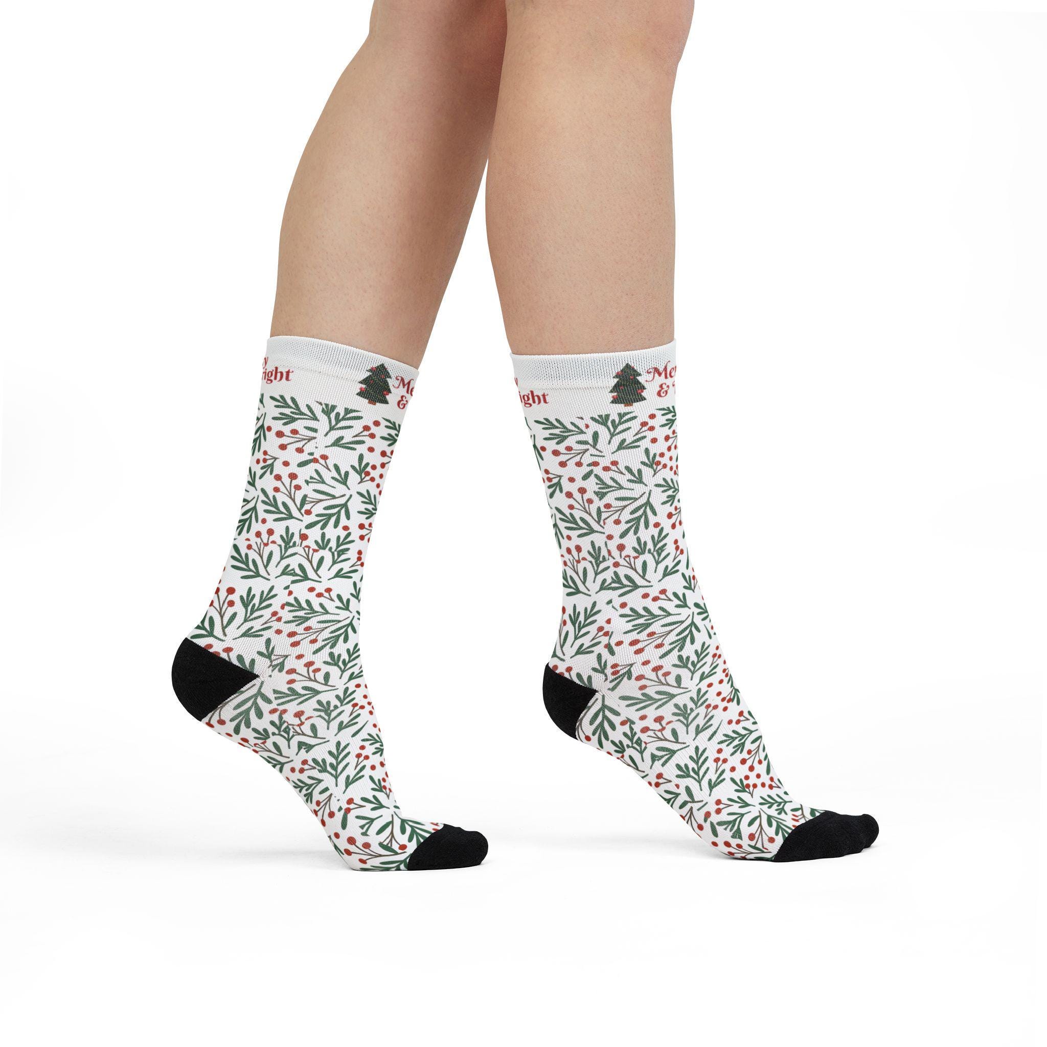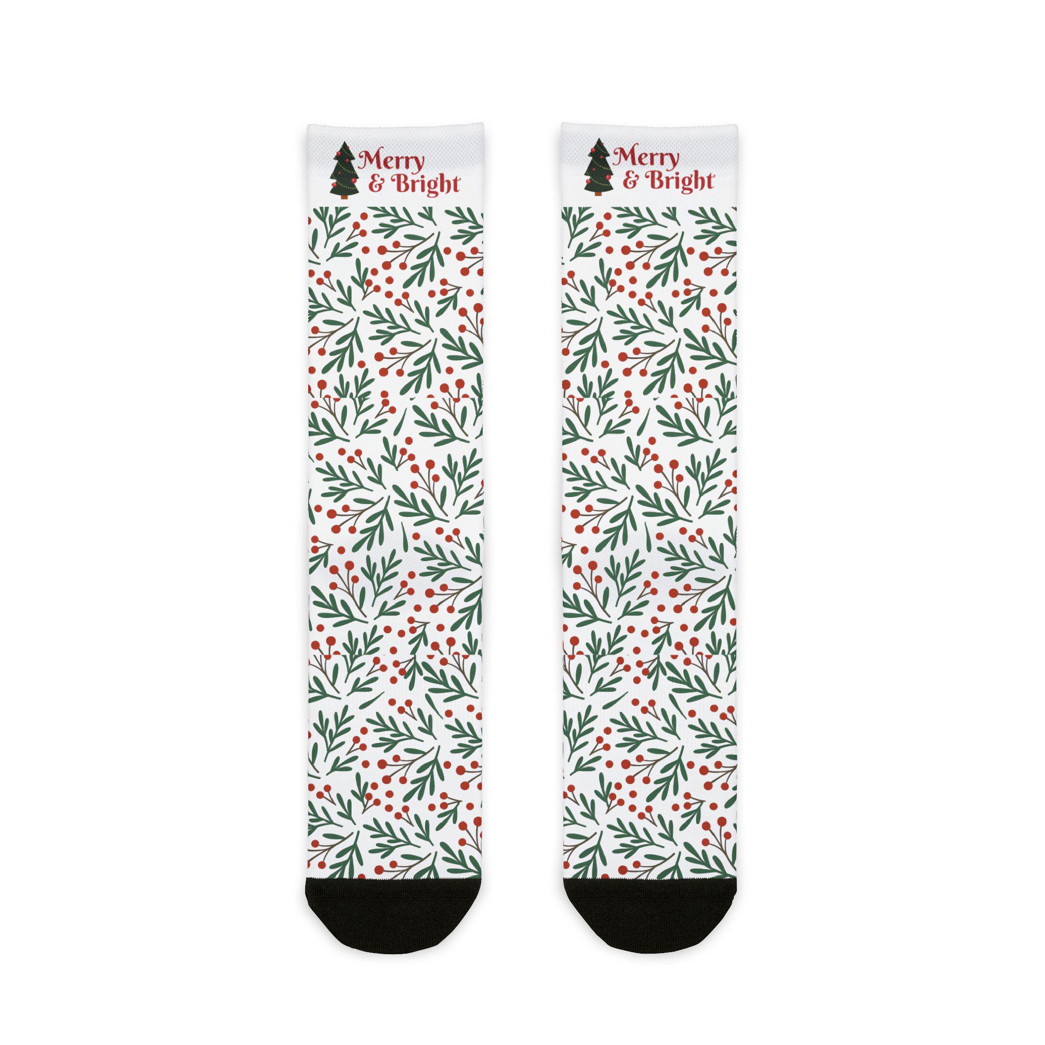 These sublimation crew socks wrap your feet in a gentle, festive hush. A delicate pattern of holly leaves and tiny berries climbs the full length of the white sock, while contrast black heels and toes add a grounded, wearable finish. At the cuff a small, hand-lettered "Merry & Bright" with a tiny pine tree tip nudges the design into holiday mode without shouting. Lightweight and soft, they slide easily into boots, loafers, or by the fire for cheesy holiday movies and slow mornings with cocoa. The fit feels snug thanks to a 200-needle knit and a touch of spandex that keeps the pattern crisp and the sock in place through long days of gift-wrapping or cozy evenings hosting friends.