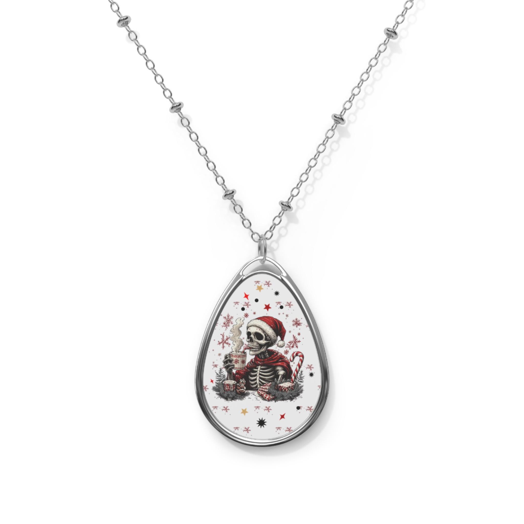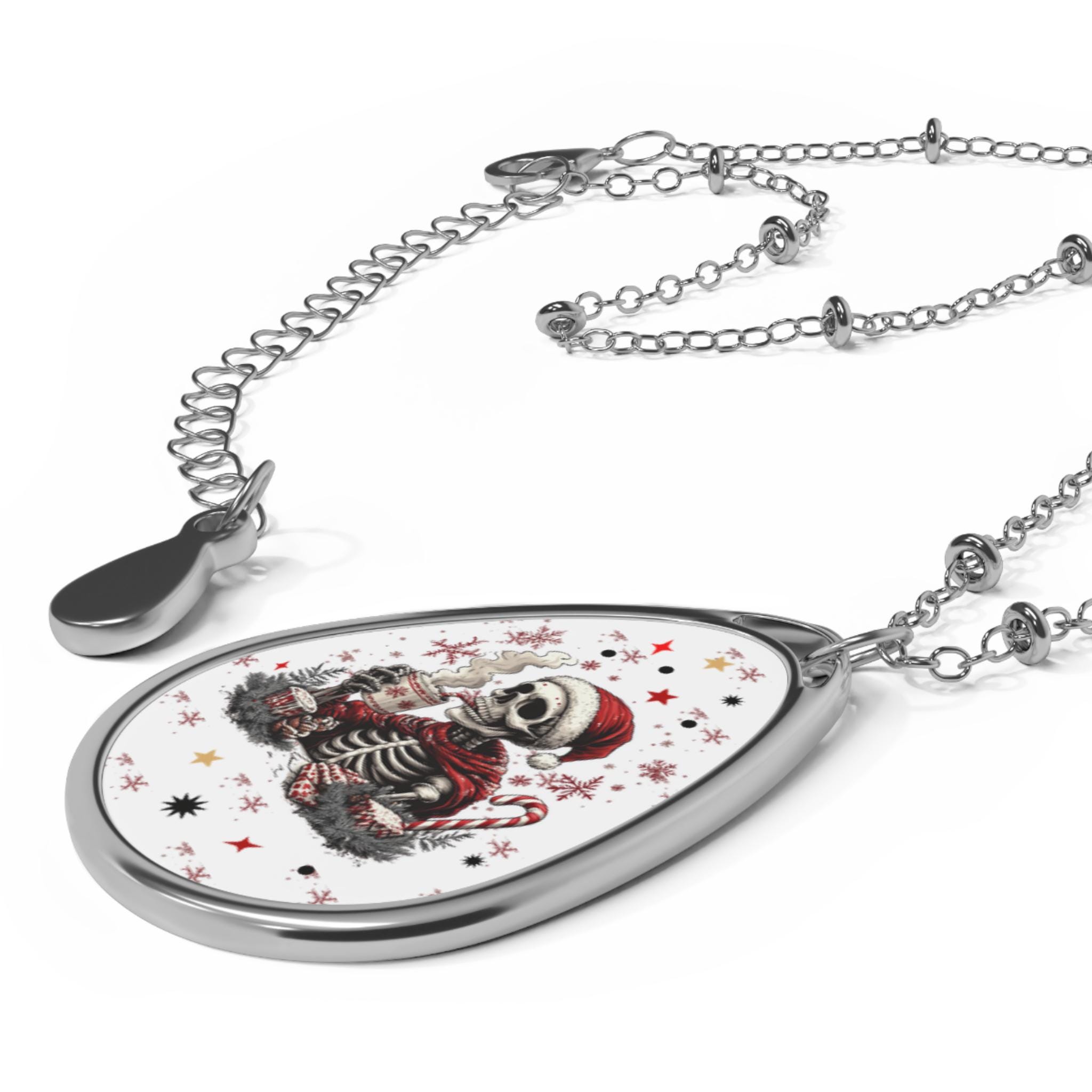 Santa Skeleton Illustration Oval Necklace | Holiday Gothic Pendant