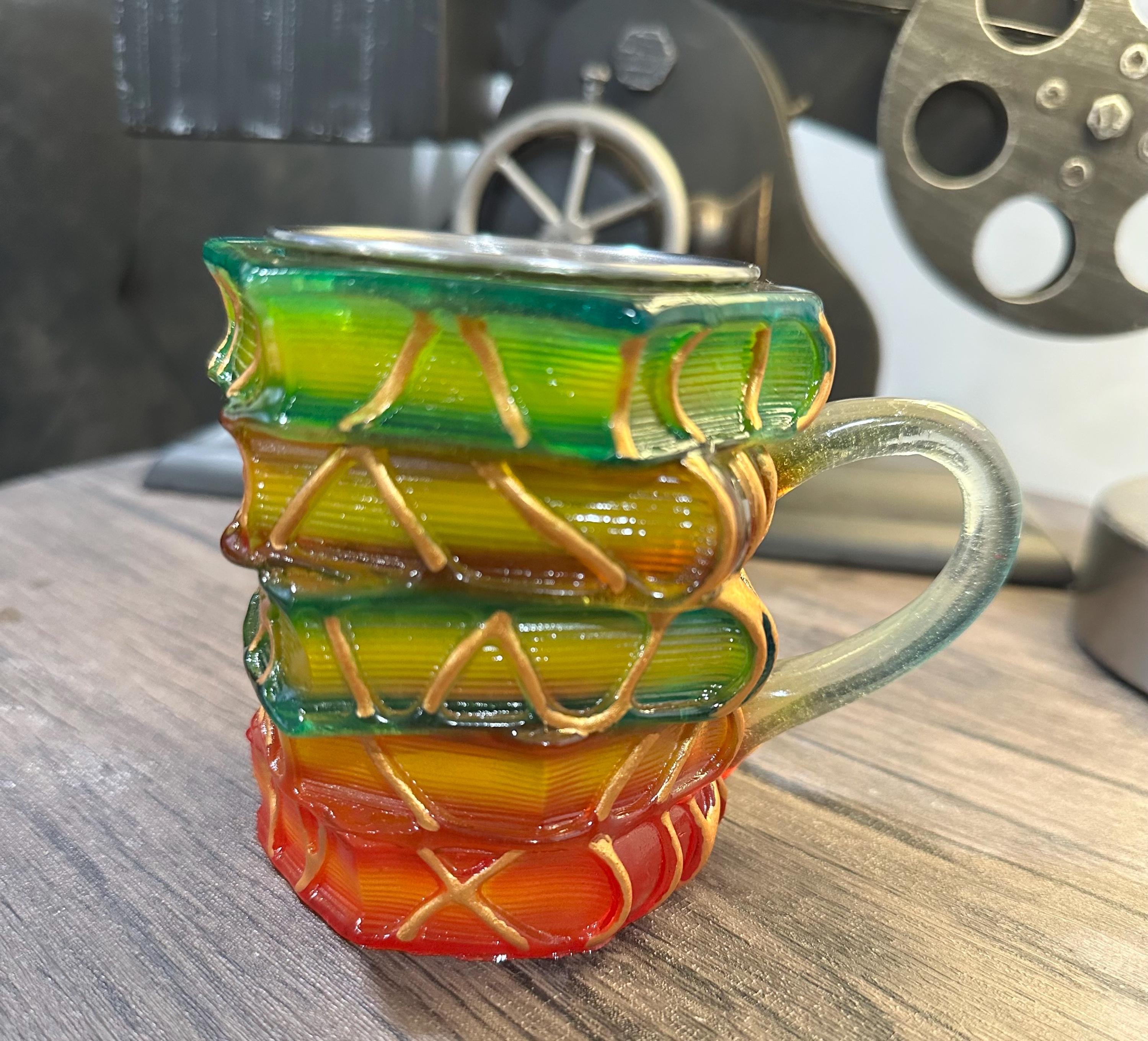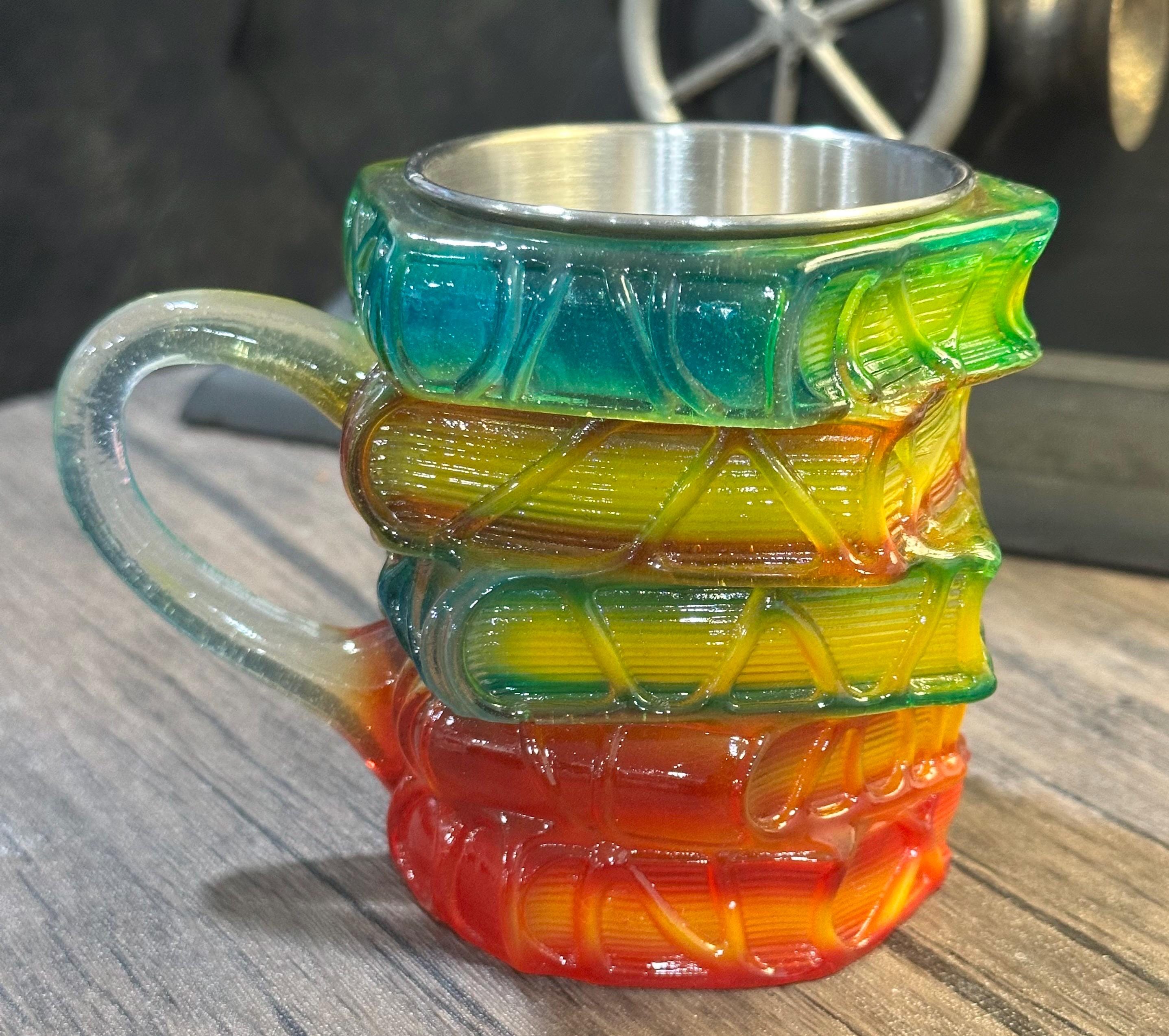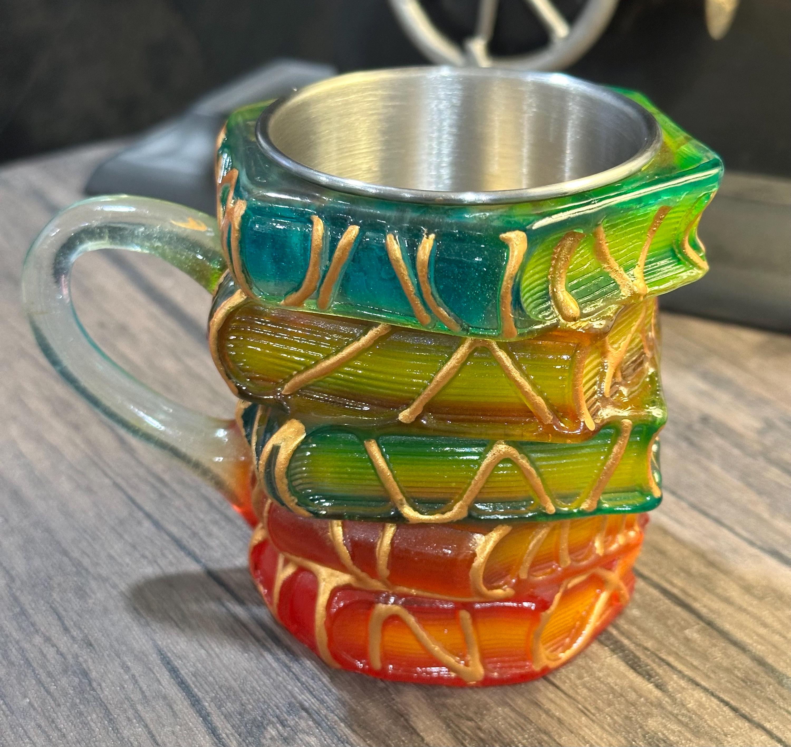 Material: stainless steel mug with a 3D resin book-stack embellishment