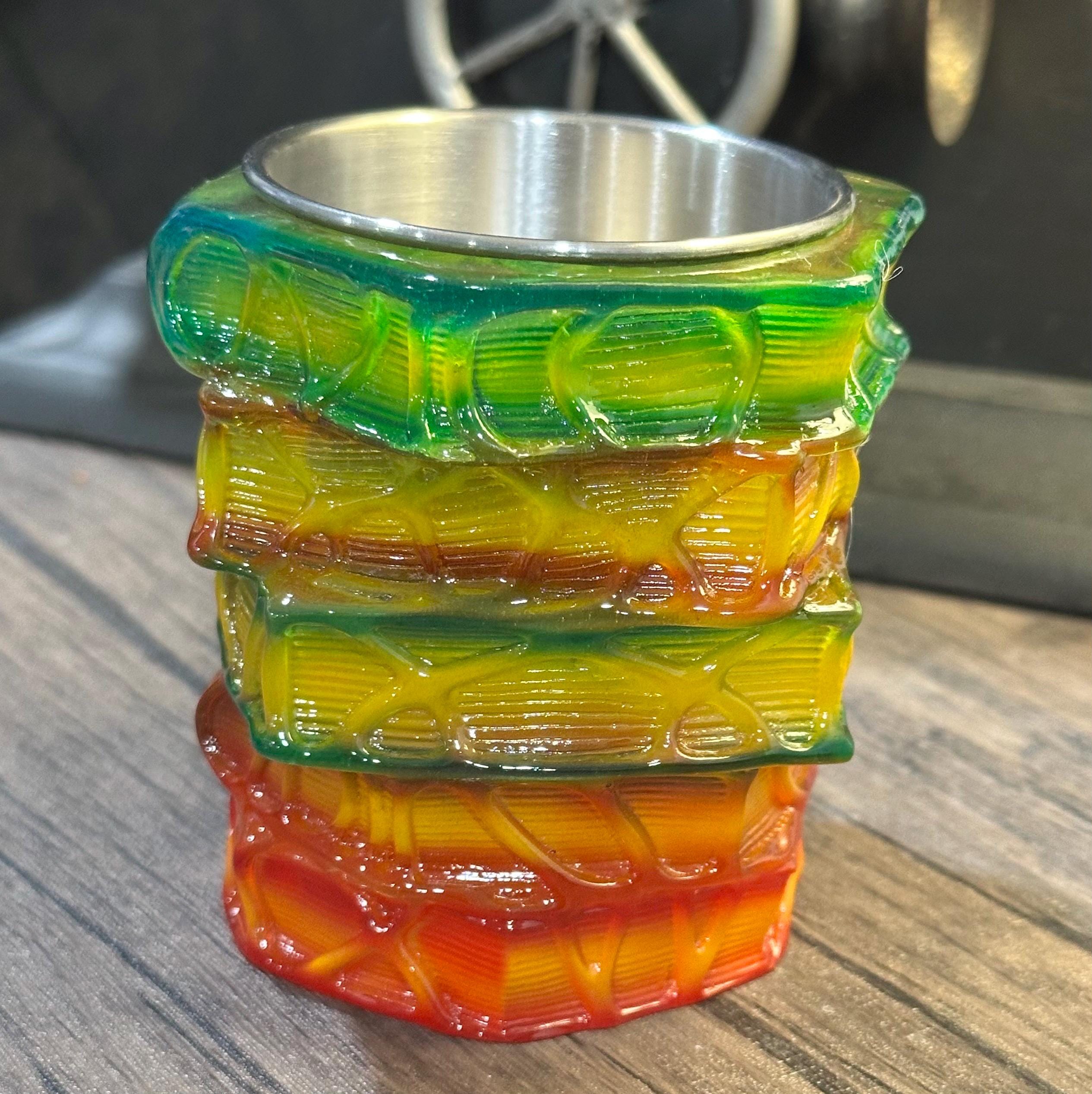 Vibrant, multi-layer “stack of books” look created with resin to resemble candy-bright colors