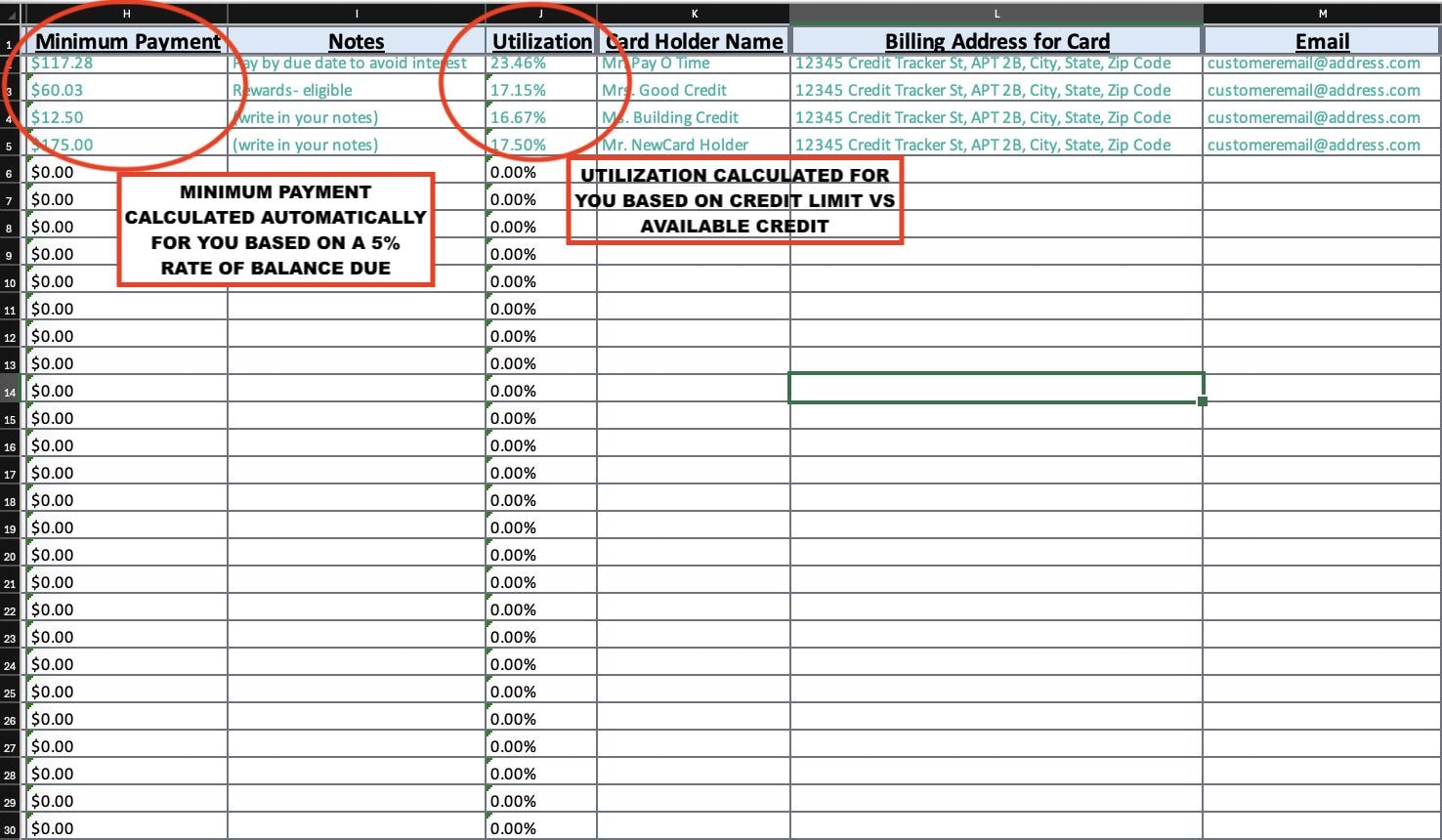 The sheet automatically calculates the minimum payment at 5% and the utilization ratio.