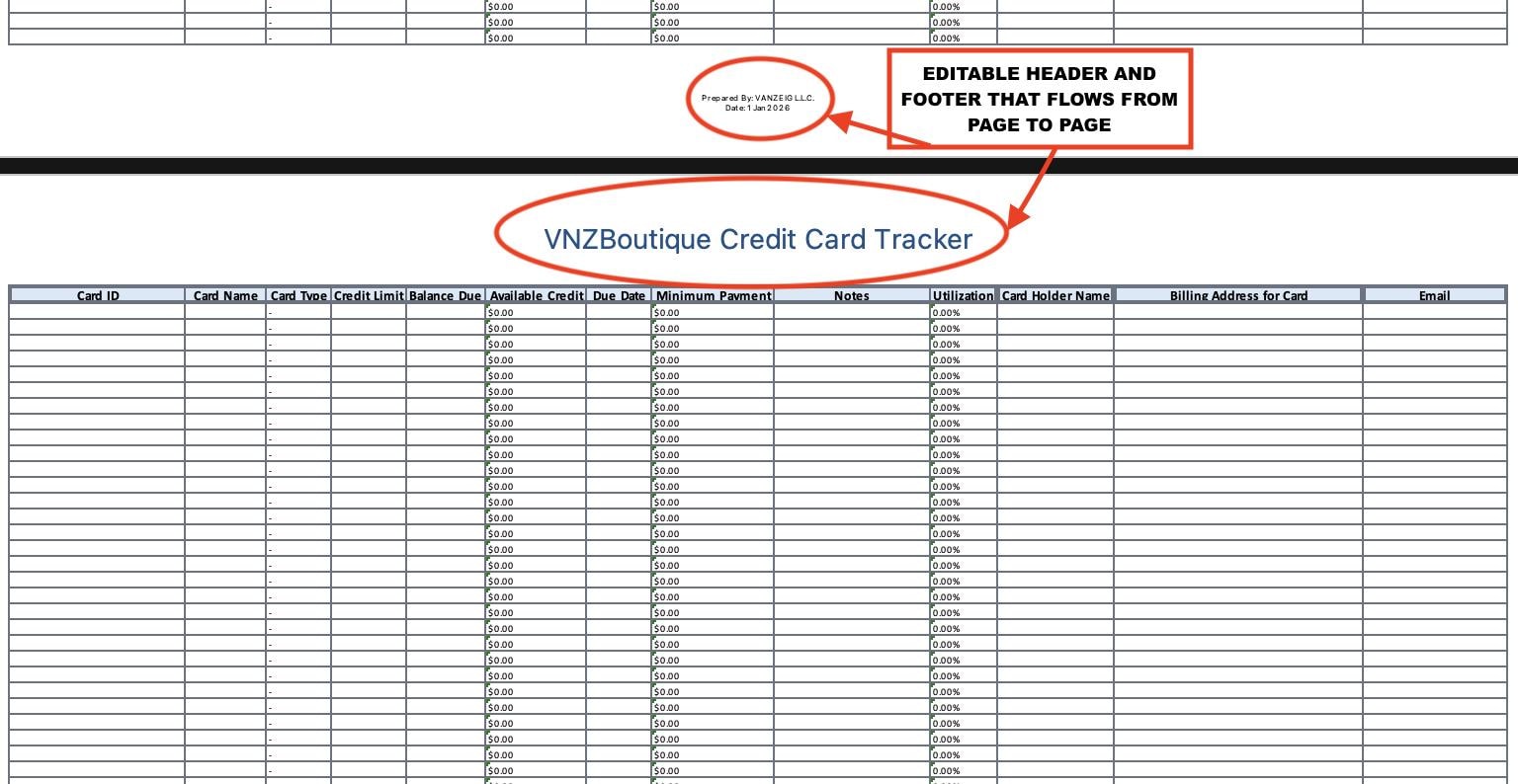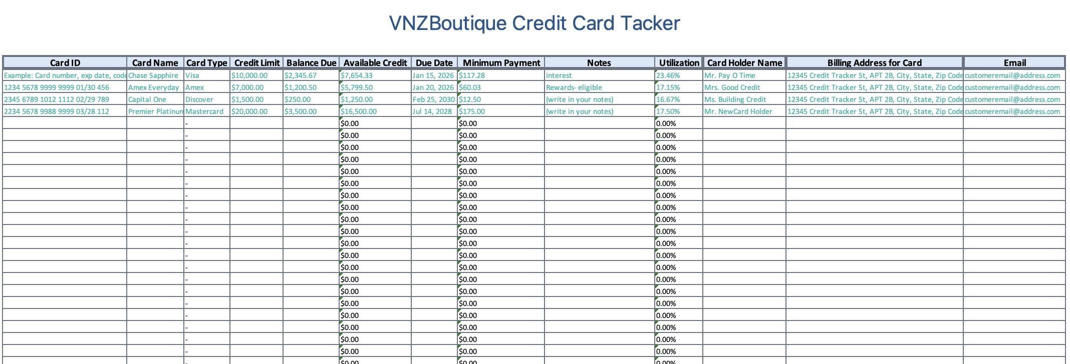 Track and manage up to 100 credit cards with precision using this downloadable Excel file. Designed to help you stay on top of payments, utilization, and key card details, it’s the perfect companion for personal finance enthusiasts and budget-conscious users. Great for small businesses and personal finance tracking.
