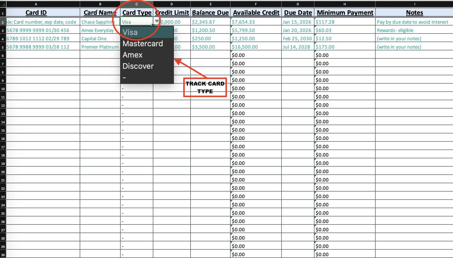 A ready-to-use Excel workbook (.xlsx) with structured sheets for card data and calculations