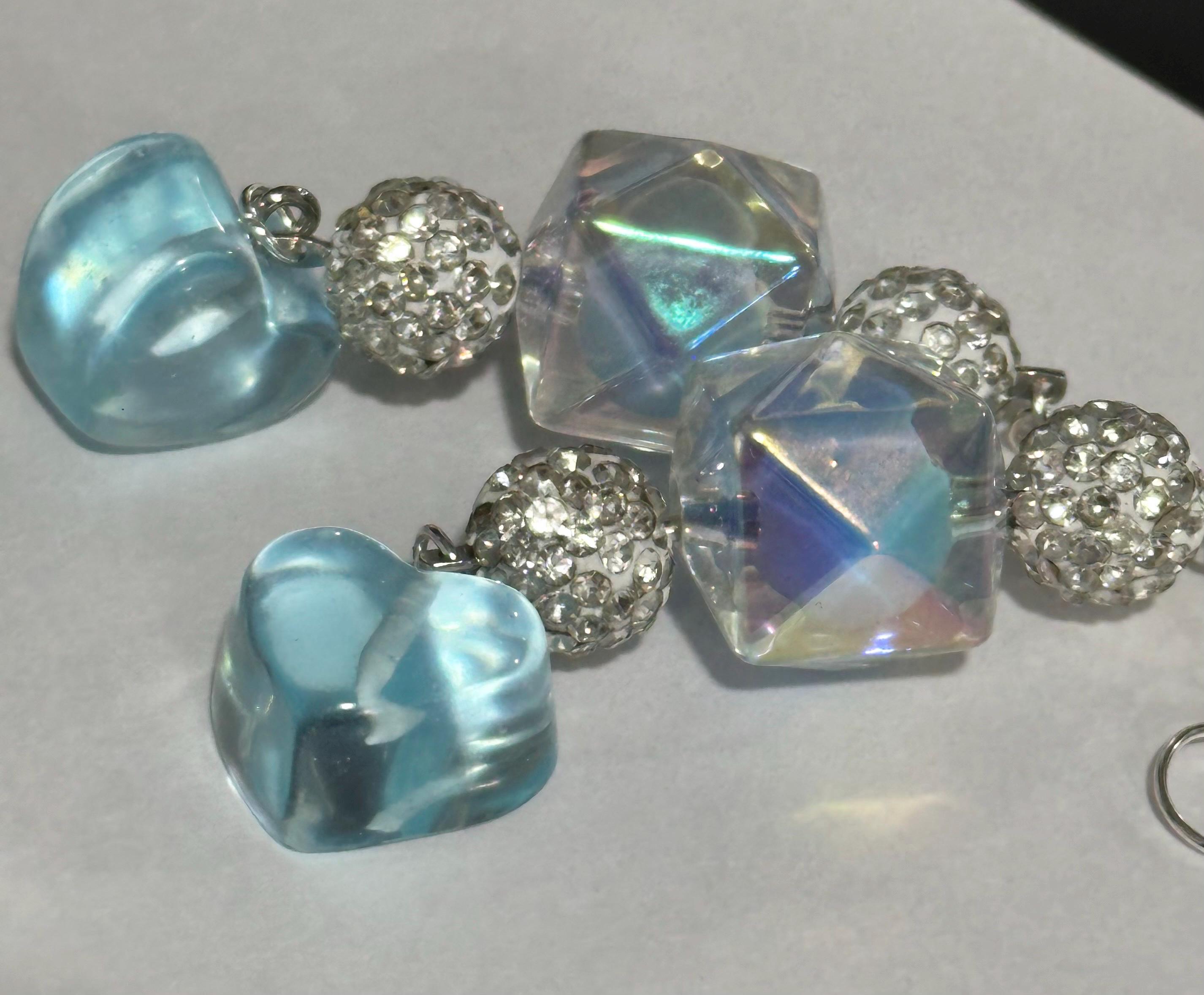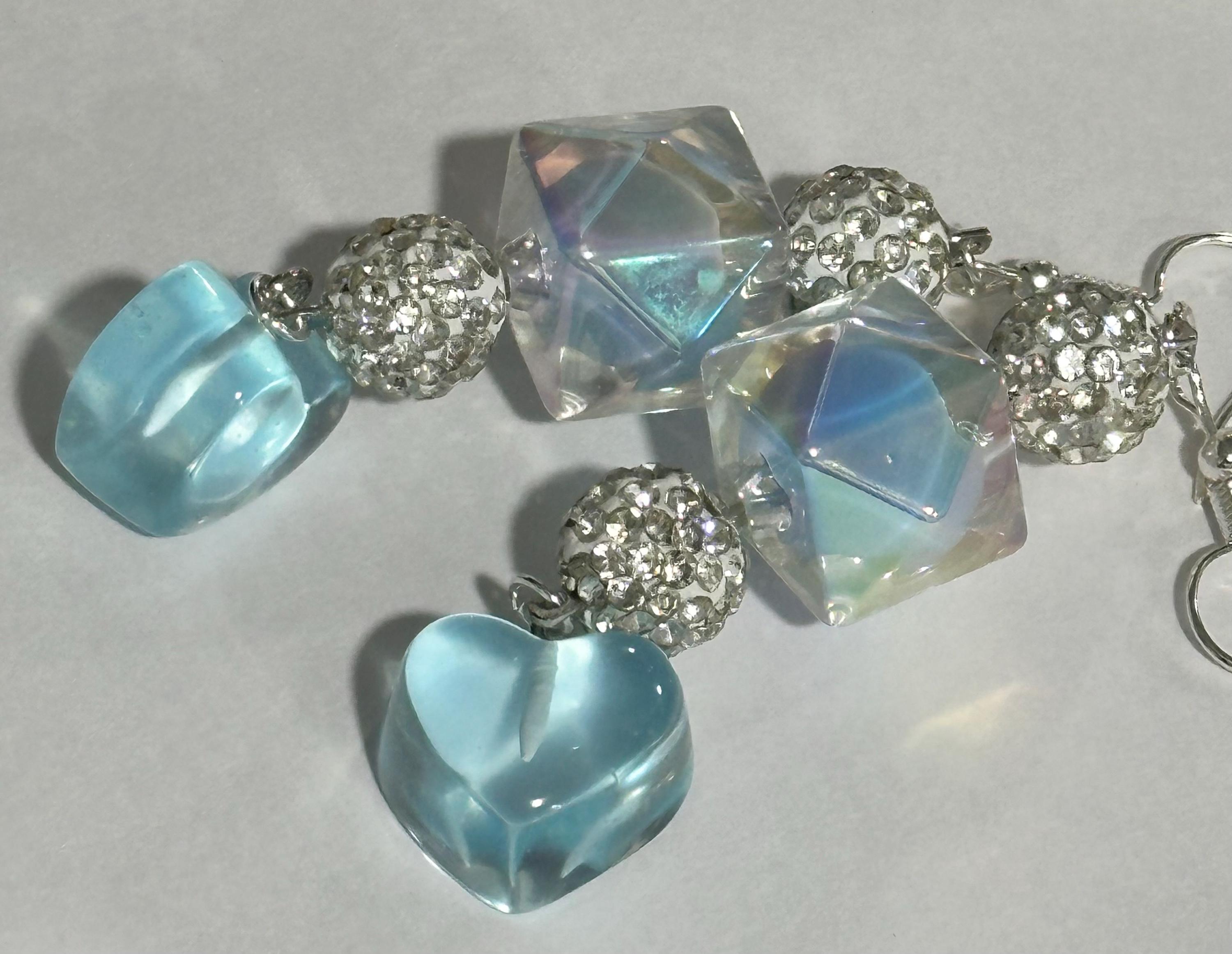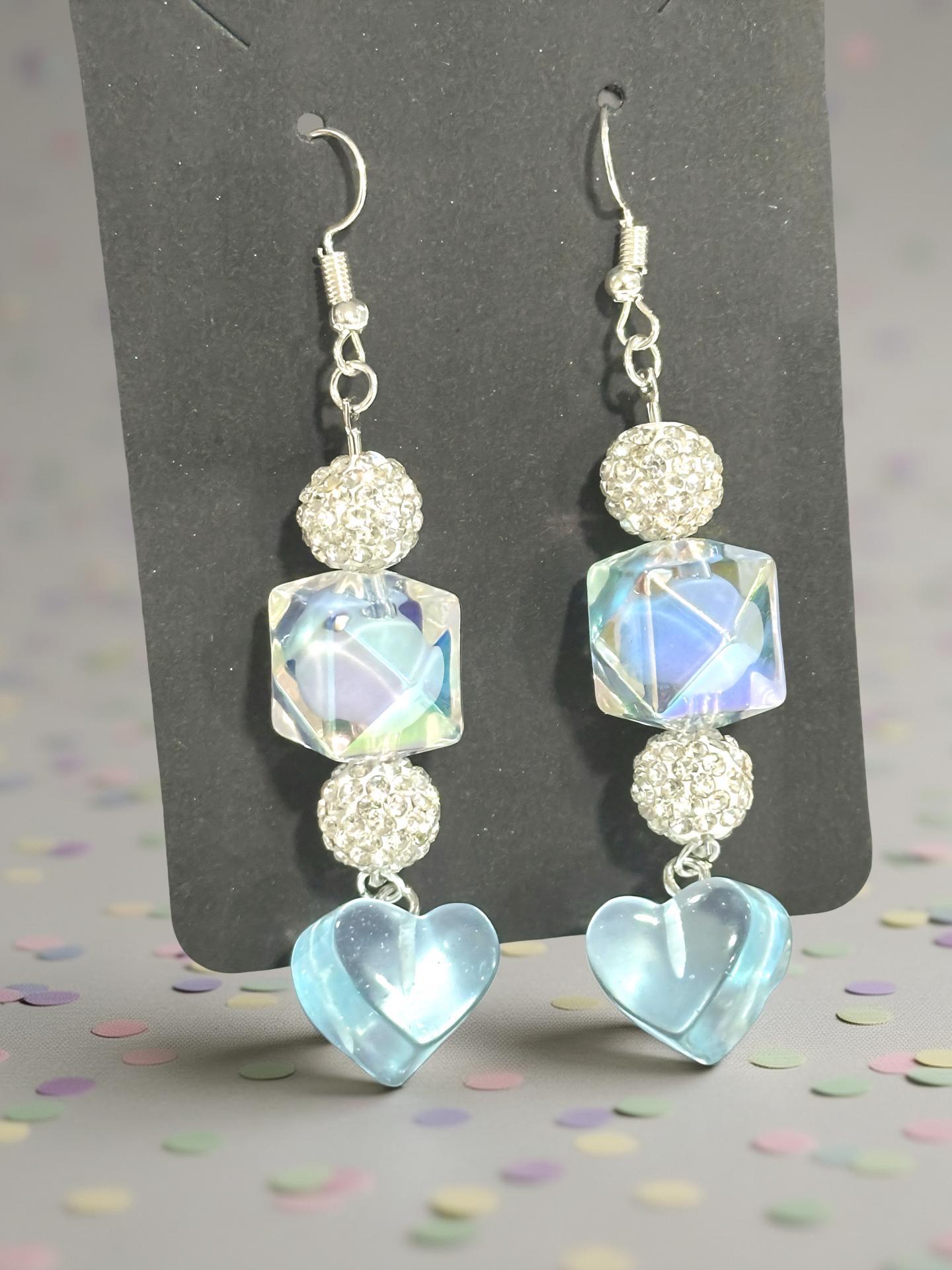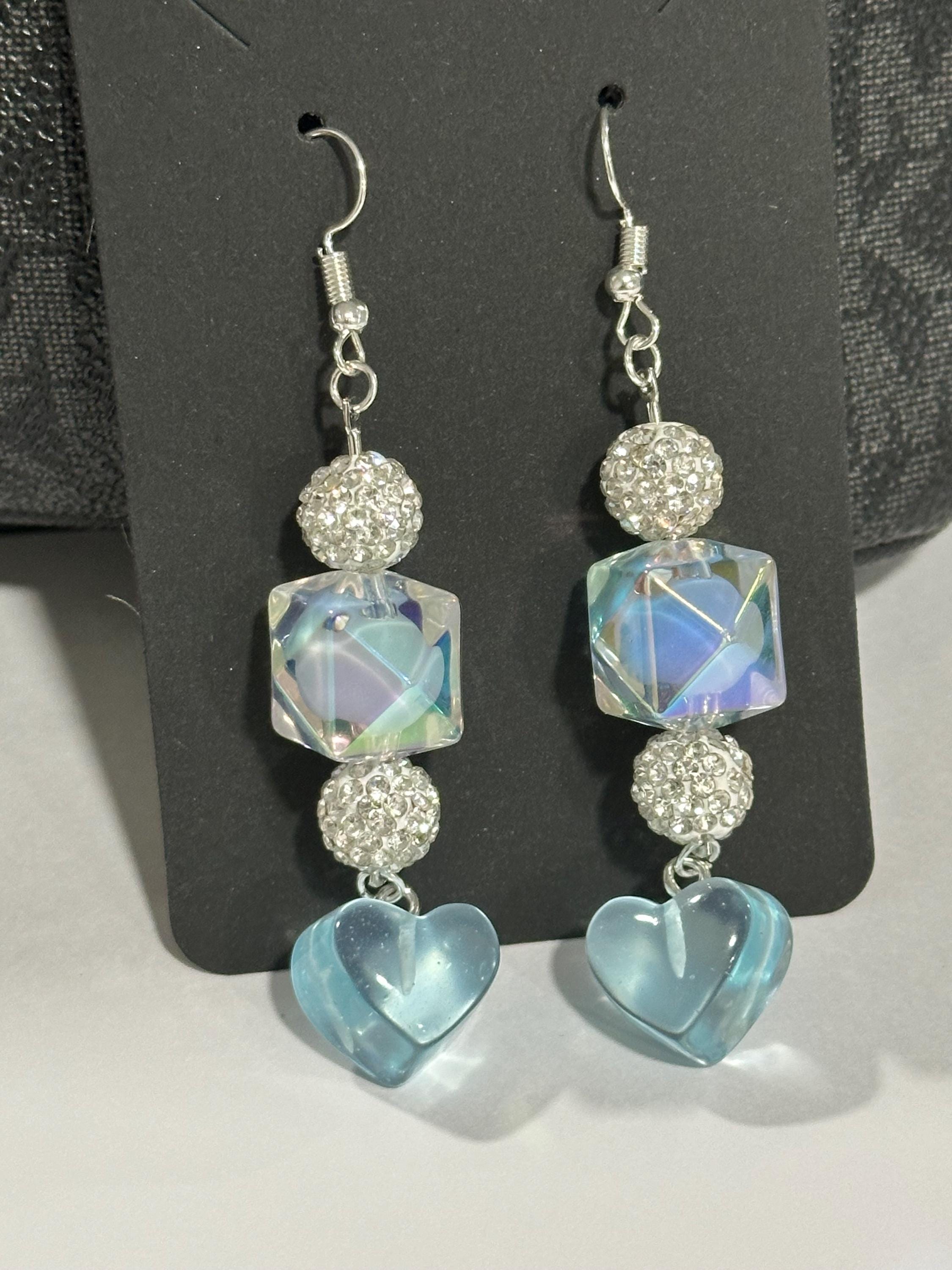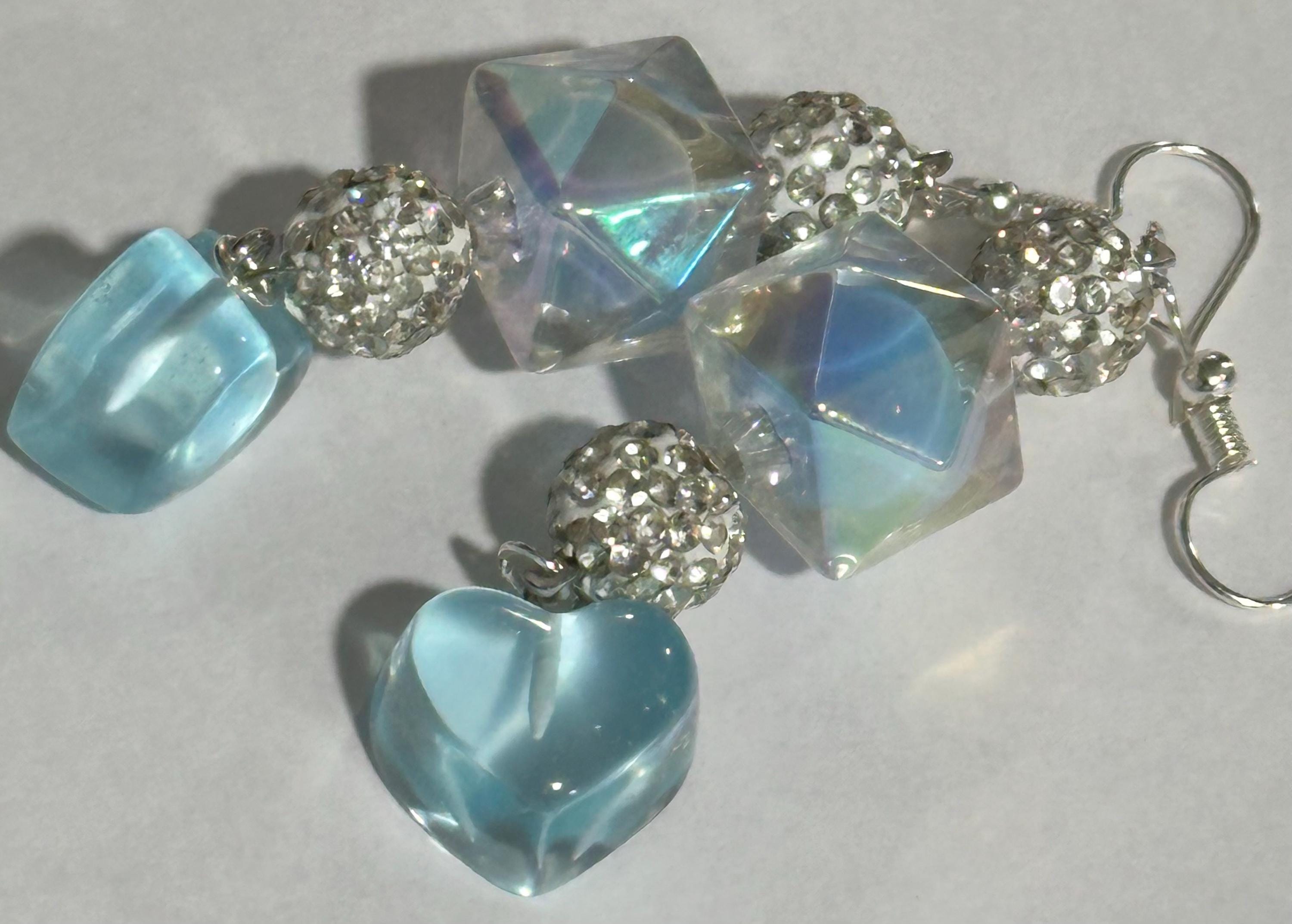 ELEGANT DESIGN: Dangle earrings featuring iridescent crystal cube beads, sparkling rhinestone-encrusted balls, and charming light blue glass heart drops for a romantic, eye-catching look