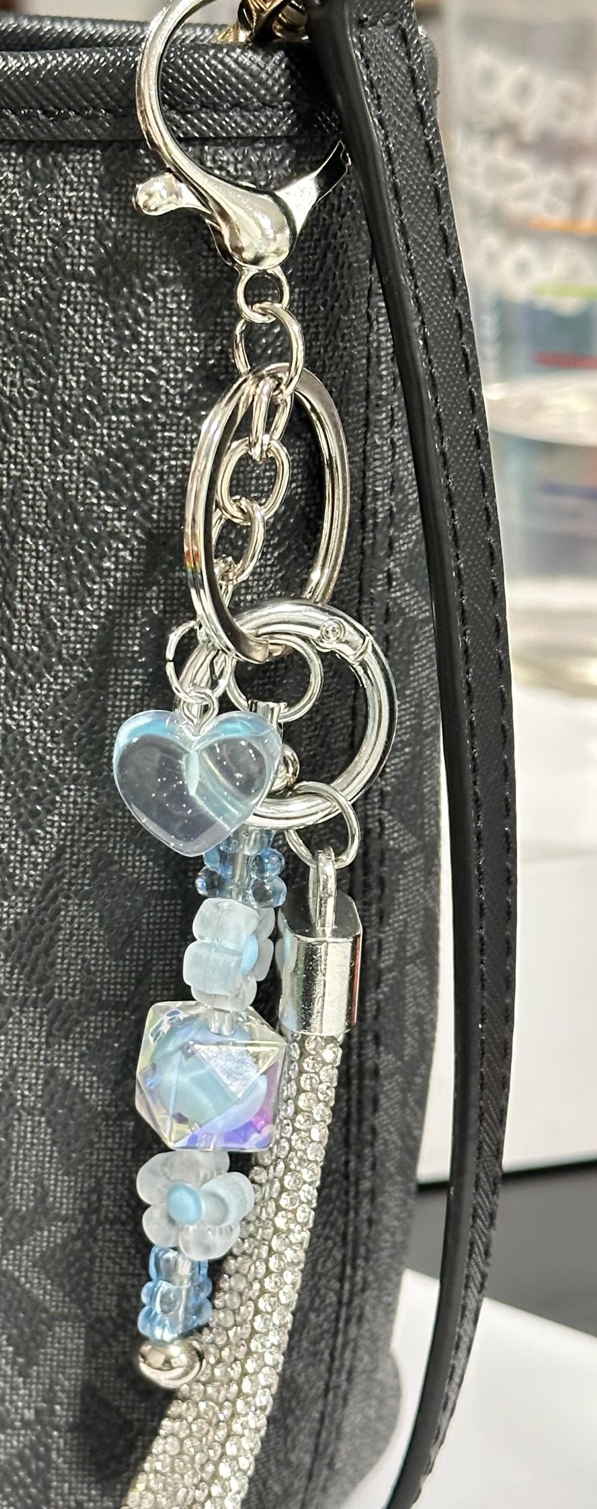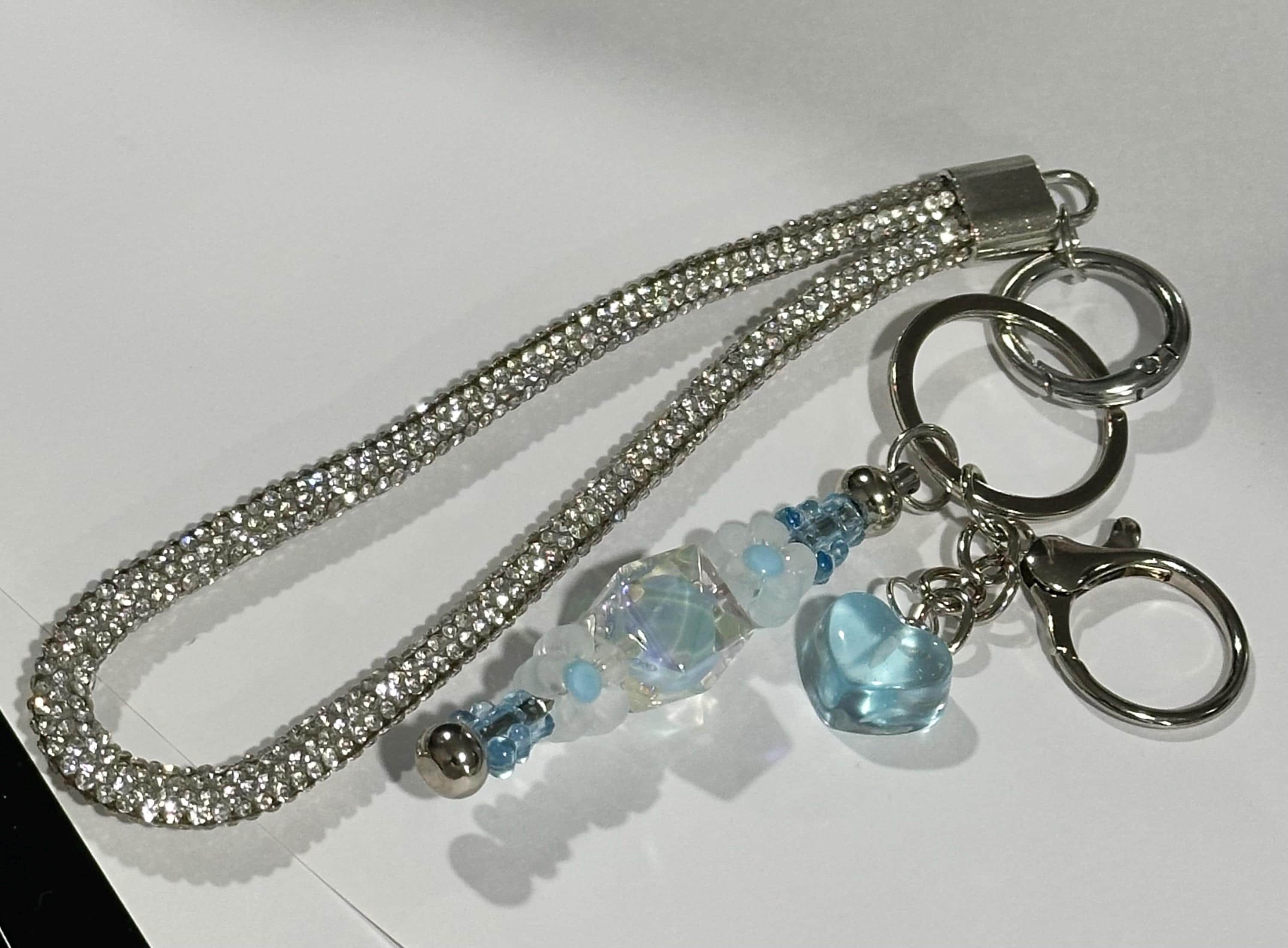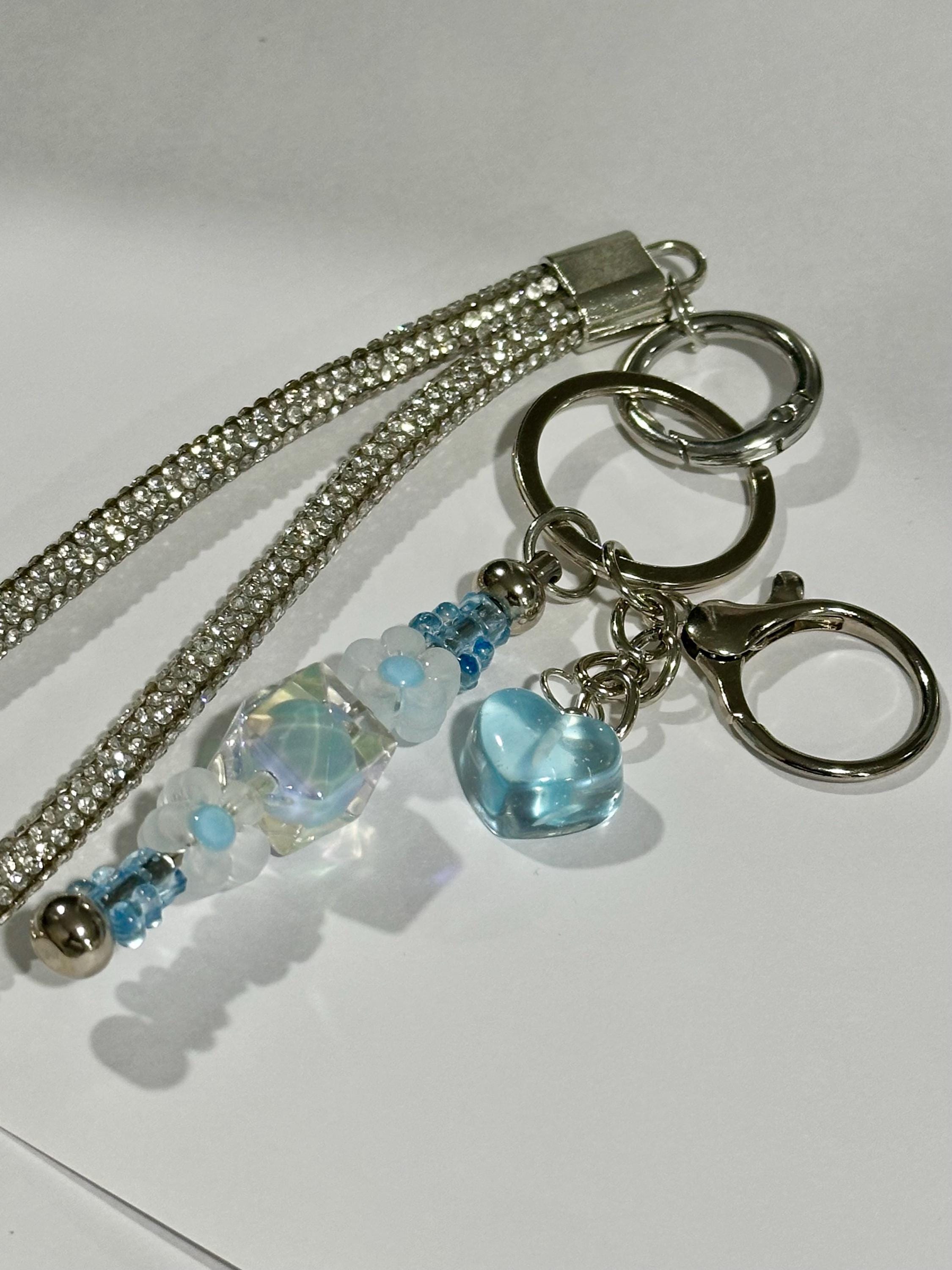 Bag Charm and Keychain with Silver Chain, Heart Charms, Crystal Beads, Rhinestone Accents